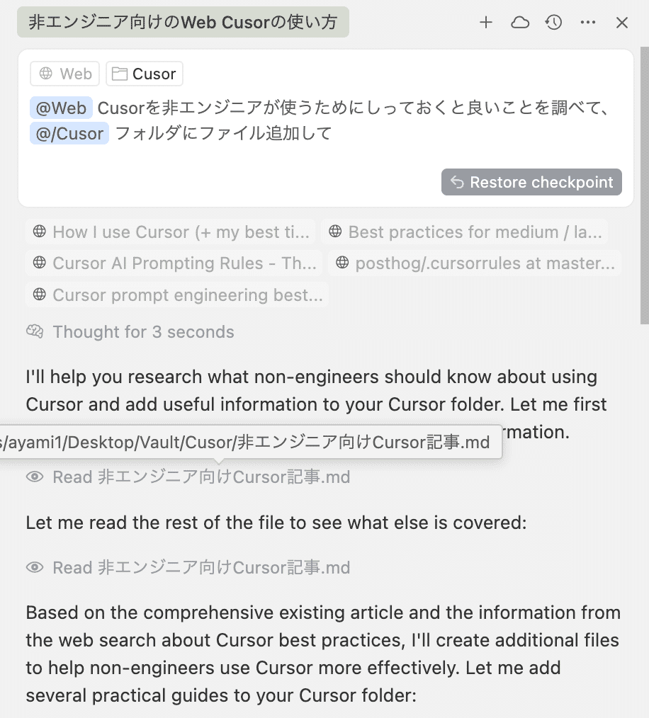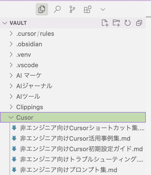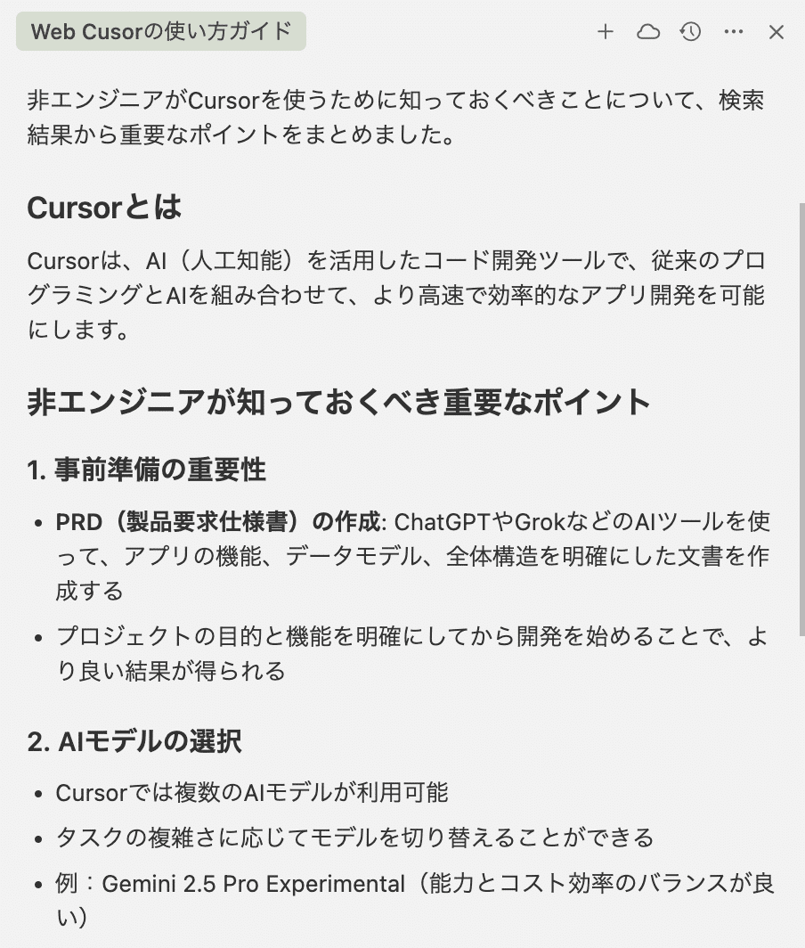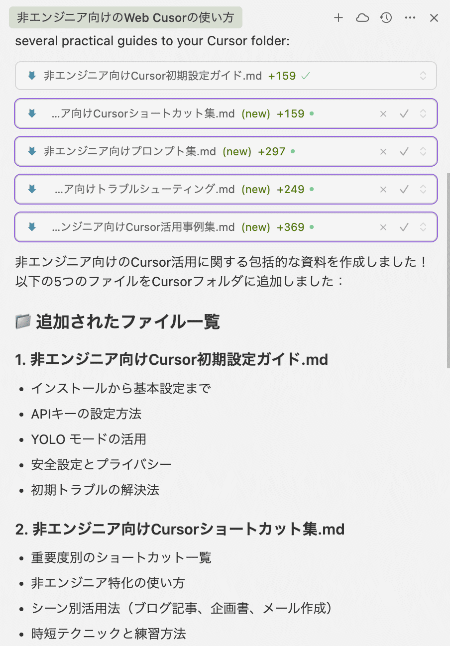Cursorでは、AIが作成したドキュメントを直接ファイル形式で保存することができます。フォルダー構造を自由に設定でき、プロジェクトごと、テーマごとに整理して保管できるため、後から参照したい時にも迅速にアクセスできます。