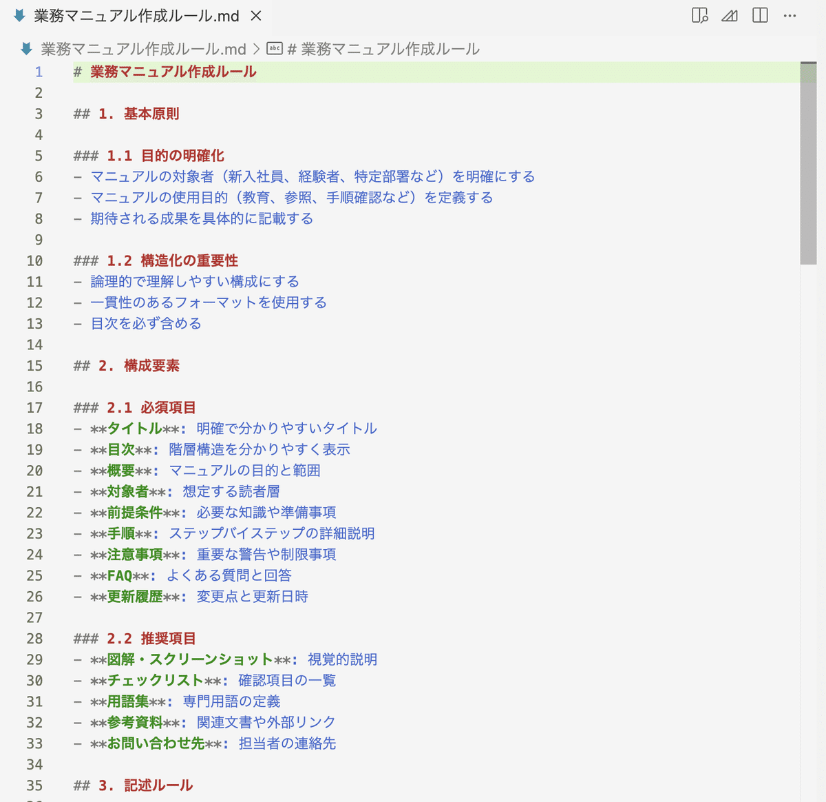 マニュアル作成ルールのファイル内は以下のようなプロンプトを入れておきます。