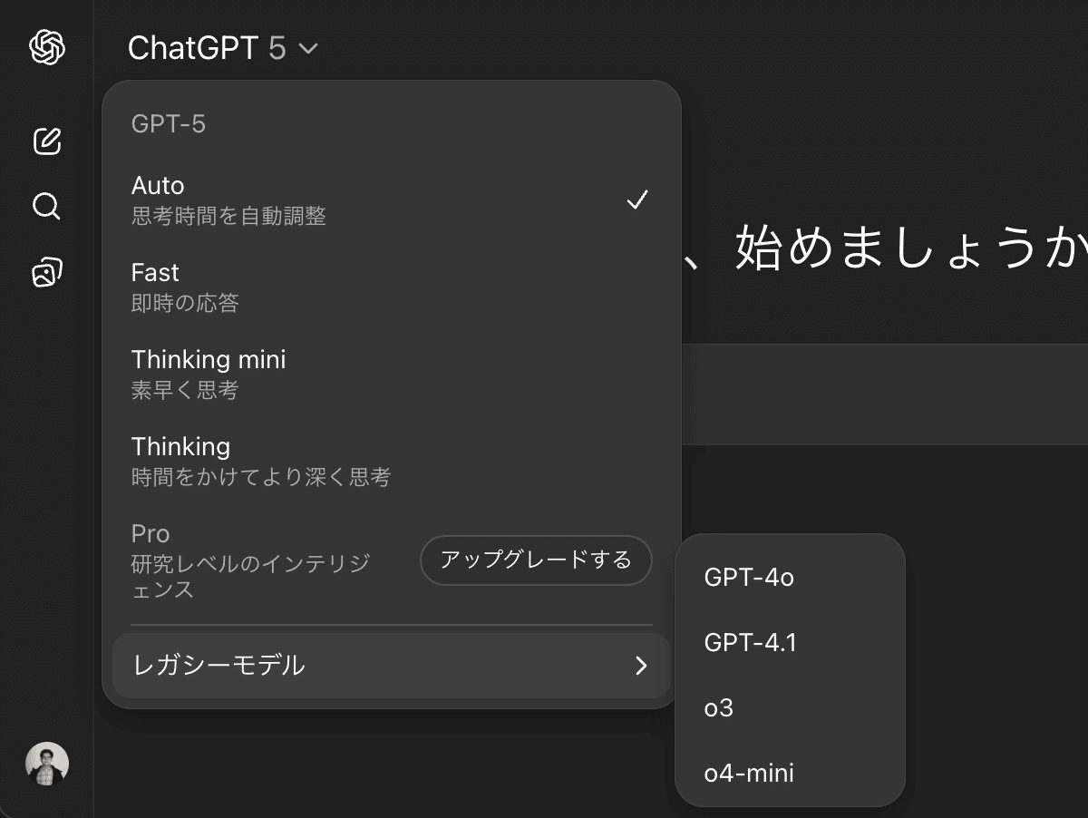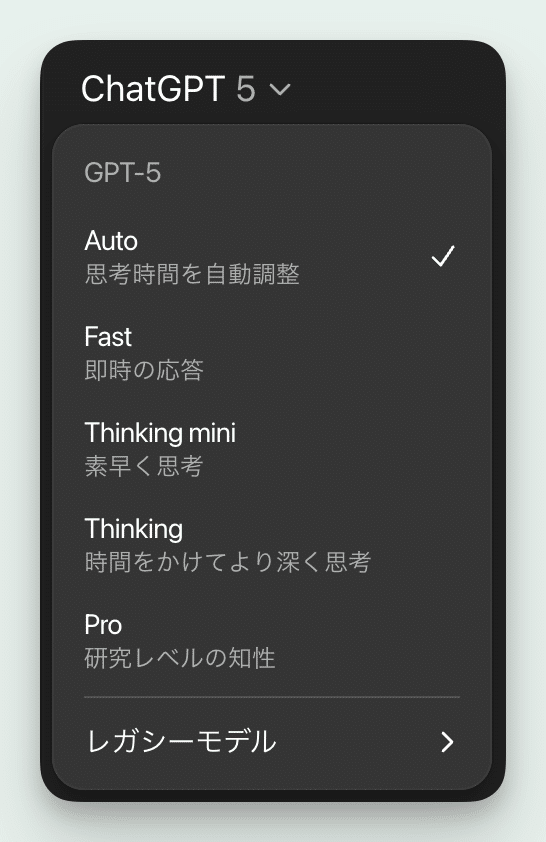 画面左上のモデルピッカーからAuto / Fast / Thinking(Thinking mini を含む)から選択できます