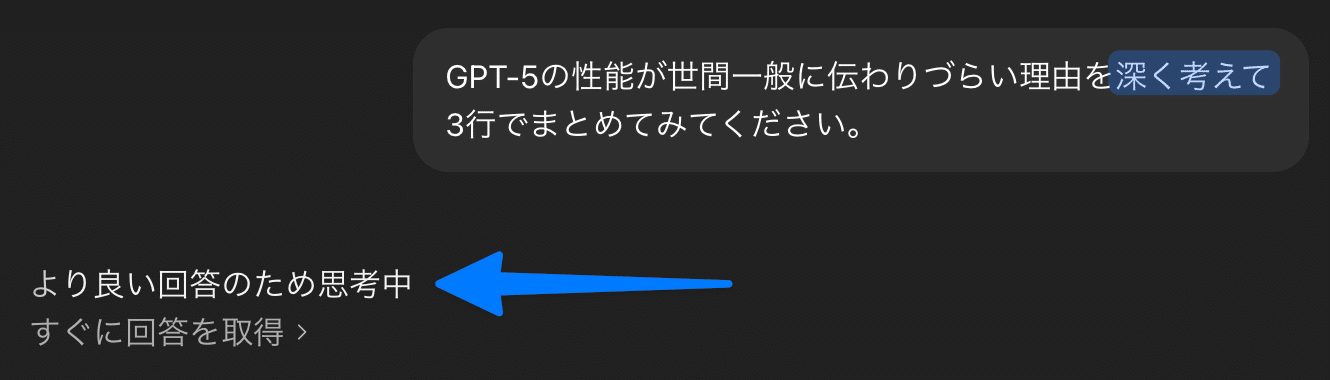 状況によりGPT-5 Thinkingへ自動で切り替わりリーズニングが発動します。自動切替は週次の手動選択上限にカウントされず、上限到達後でも発動する場合があります。