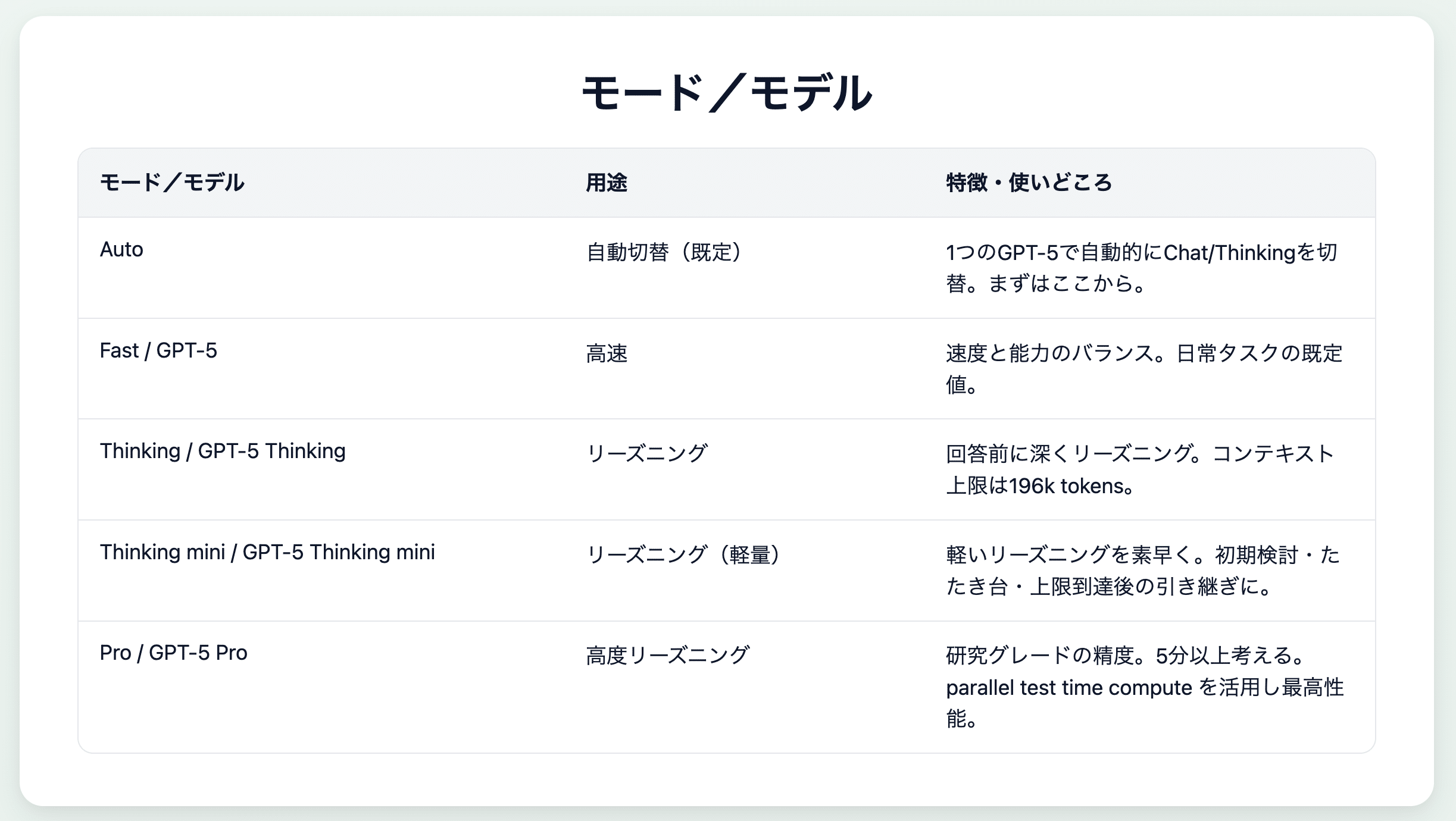 ウェブ版のChatGPTで表示されている新しく追加されたモデルは以下の通りです。モードと使いどころも含めて一枚にまとめました。