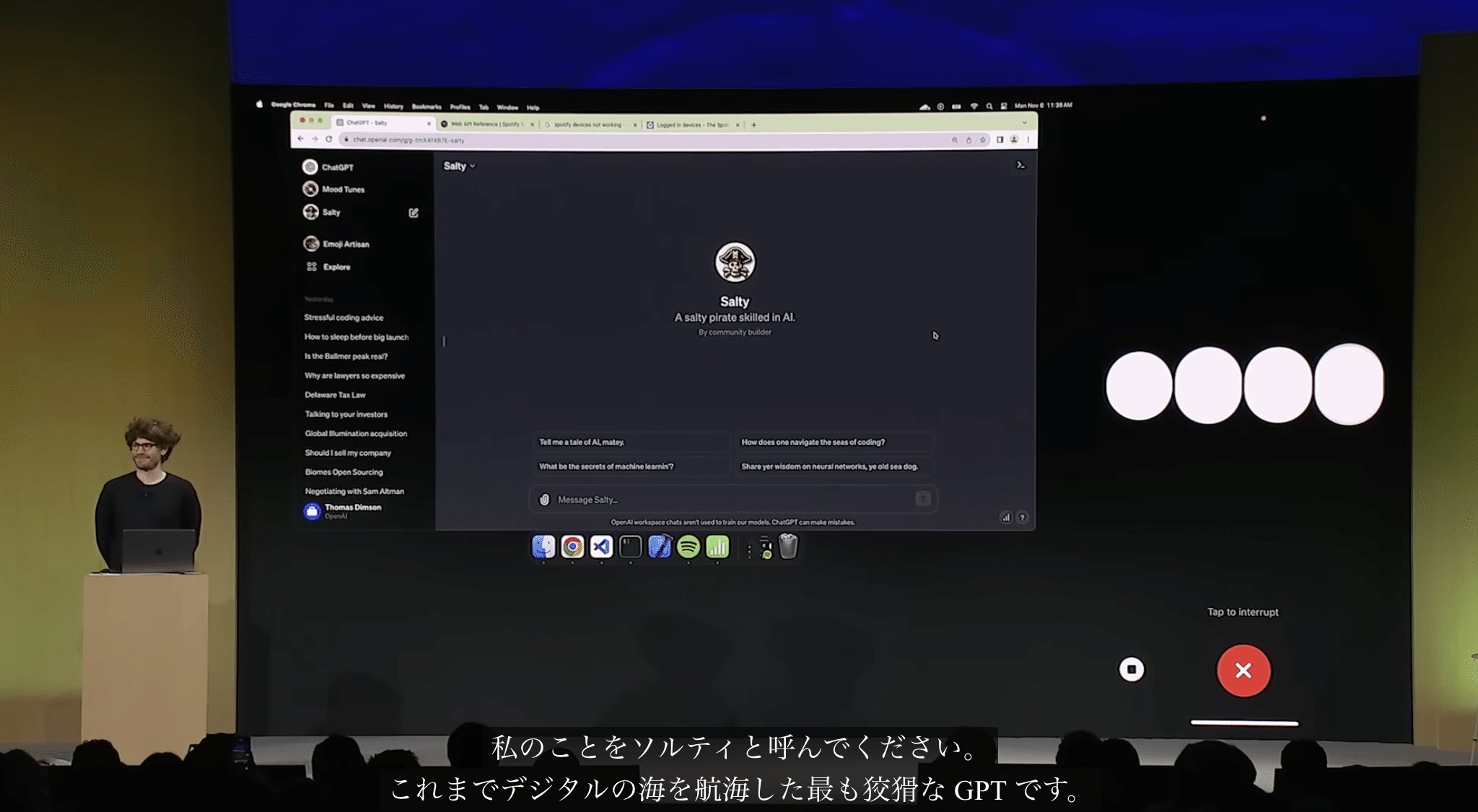 GPTの特徴は、指示を理解し行動する能力にあります。これにより、AIに特有の個性を持たせることができます。例えば、OpenAIはパイレーツをテーマにしたGPTを披露しました。この「キャプテン・コーダー」はパイレーツアクセントで応答し、カスタマイズの可能性を示しました。(なお、デモでは一般ユーザーには未公開のパイレーツ風のボイスが使われていました。)