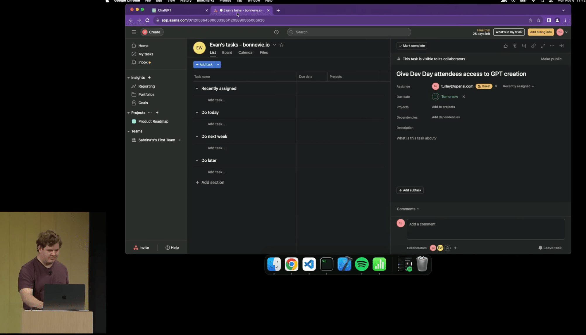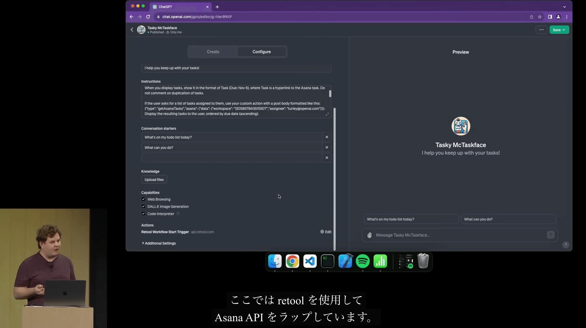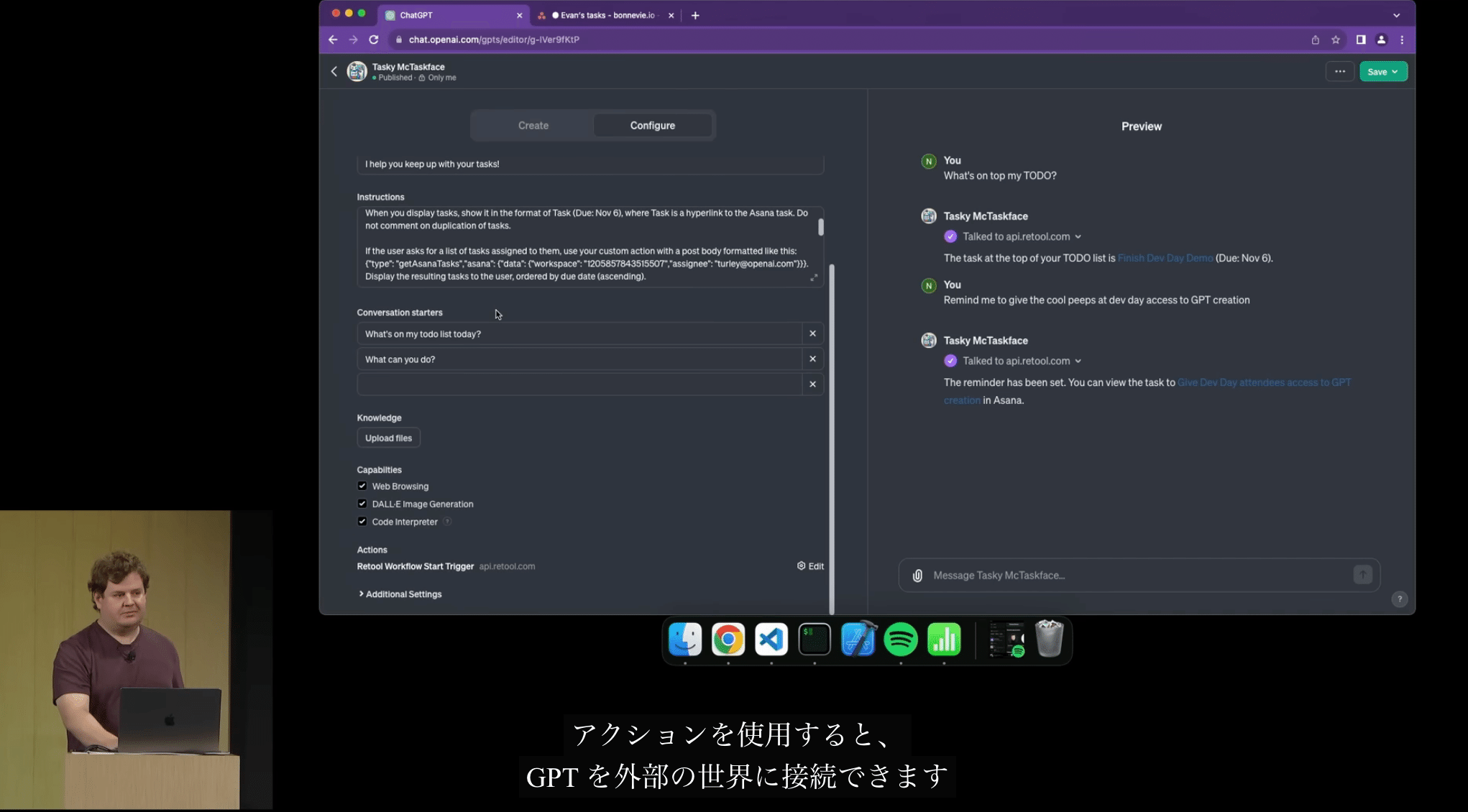 GPTは「アクション」機能により現実世界との対話が可能です。この機能で、AIはデジタルコマンドを現実の結果に変換します。例として、「Tasky Mc Taskface」を披露しました。GPTはAsana APIを通して、ToDoリストの管理を行い、プロジェクト管理ツールと連携します。これにより、GPTは実用的なツールへと進化します。