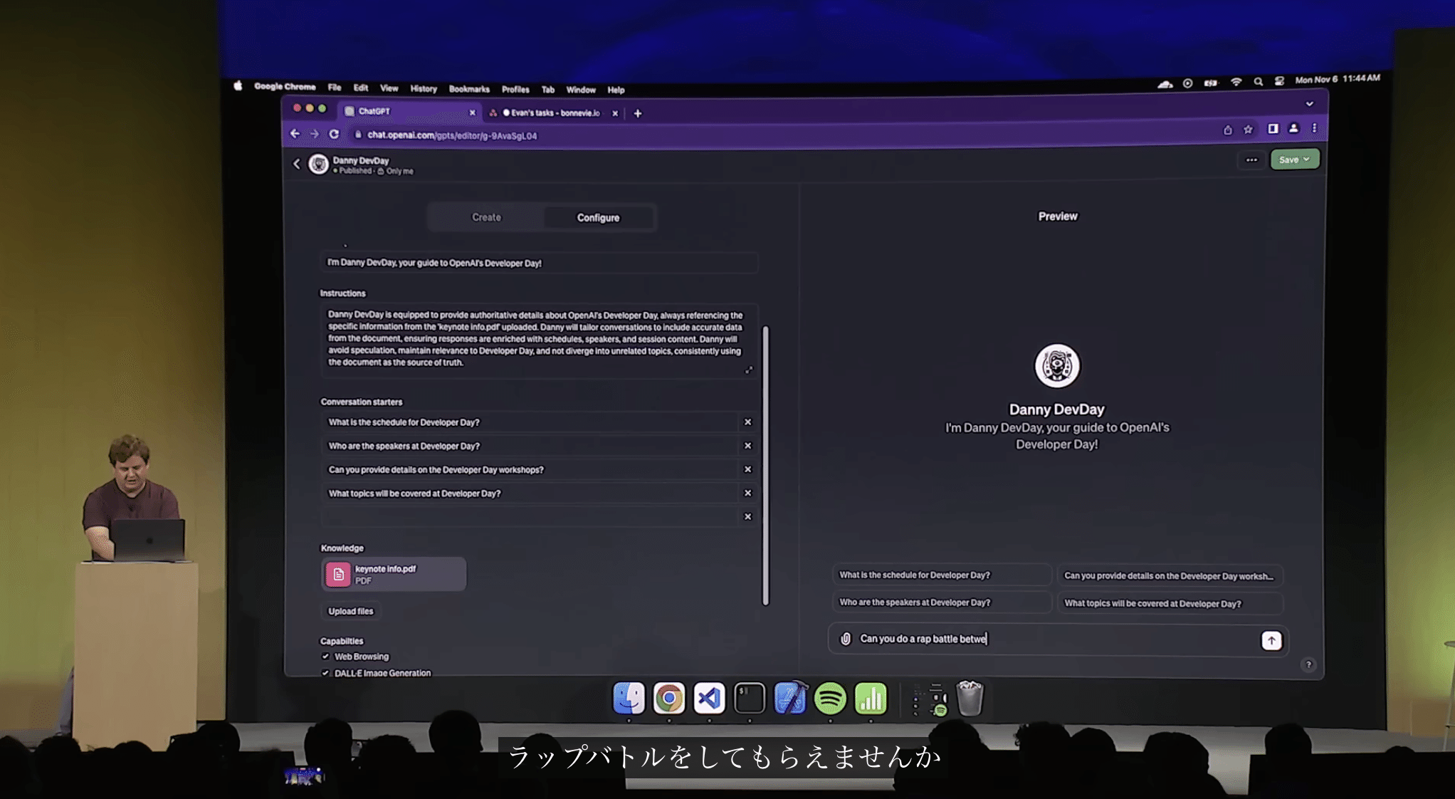 GPTのもう一つの特徴は知識統合です。これにより、AIは外部情報を取り込み、知識ベースを拡張できます。例えば、「Dany・DevDay」という、OpenAI DevDayのサムアルトマンのスピーチスクリプトをPDFとして読み込ませた、特定の情報を持ったカスタマイズGPTを作成するデモが行われました。この機能によって、簡単に外部の情報を取り込むことができ、文脈に沿ってその情報を活用してくれるGPTを作ることができます。デモでは、DevDayの内容を要約してもらったり、既存のAPIと最新のAPIで何が違うのかをテーマにラップを作らせる様子が披露されました。