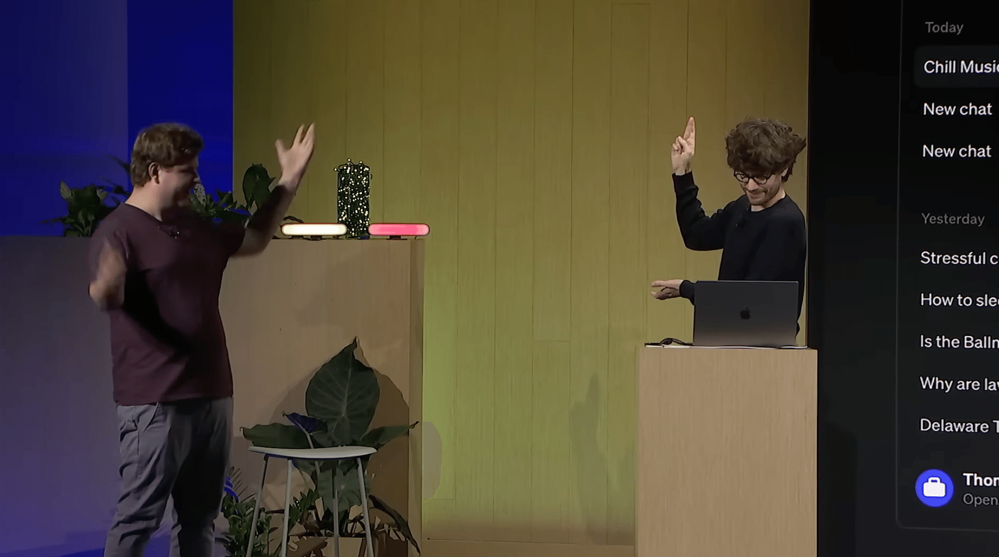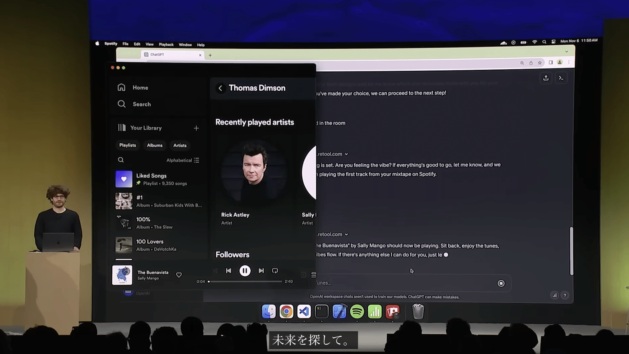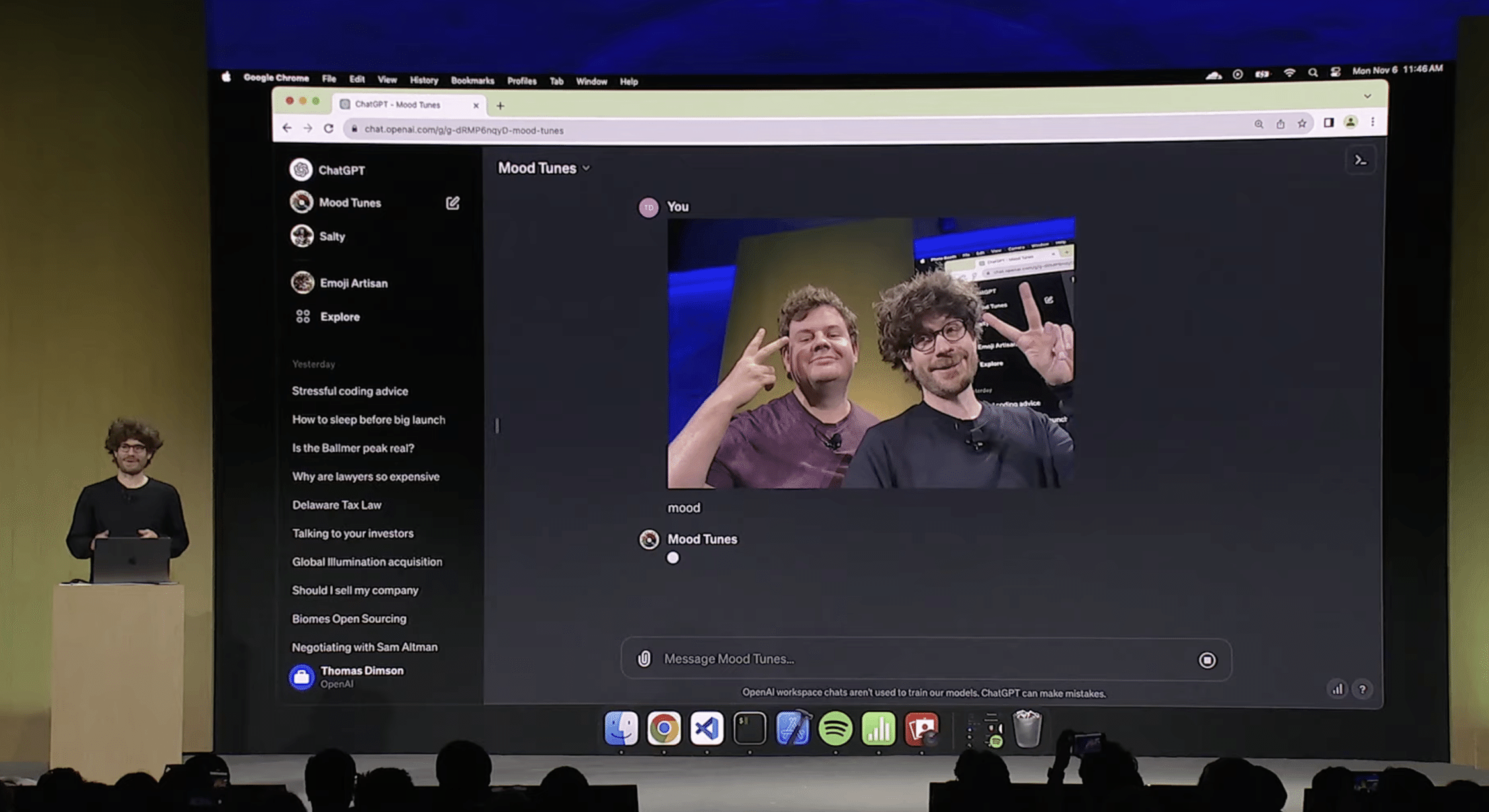 GPTプレゼンテーションのハイライトは、機能を組み合わせたライブデモでした。「ムード・チューンズ」GPTは、画像から画像内のムードを読み取り、音楽プレイリストを作成、そしてSpotifyと連携しChatGPTから音楽の再生するデモも行われました。