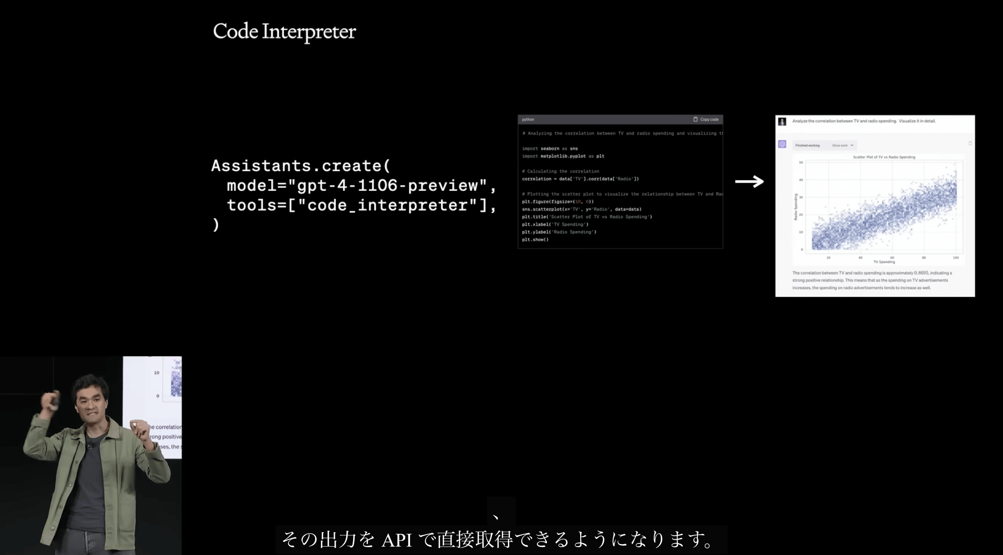 コードインタープリターを利用することで、AIは安全な環境でコードを書いたり実行したりできます。その出力はAPIで直接取得可能です。