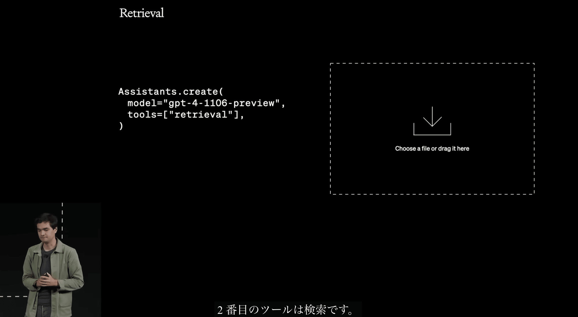 アシスタントAPIのもう一つのツールは、検索です。この機能により、AIは基本的な知識に外部情報を加えることができ、それをもとに応答することができます。ショッピングアプリのための製品情報の統合から、研究ツールのための特定文書を埋め込むことまで、知識取得はより情報豊富で文脈に即したAIアシスタントを可能にします。
