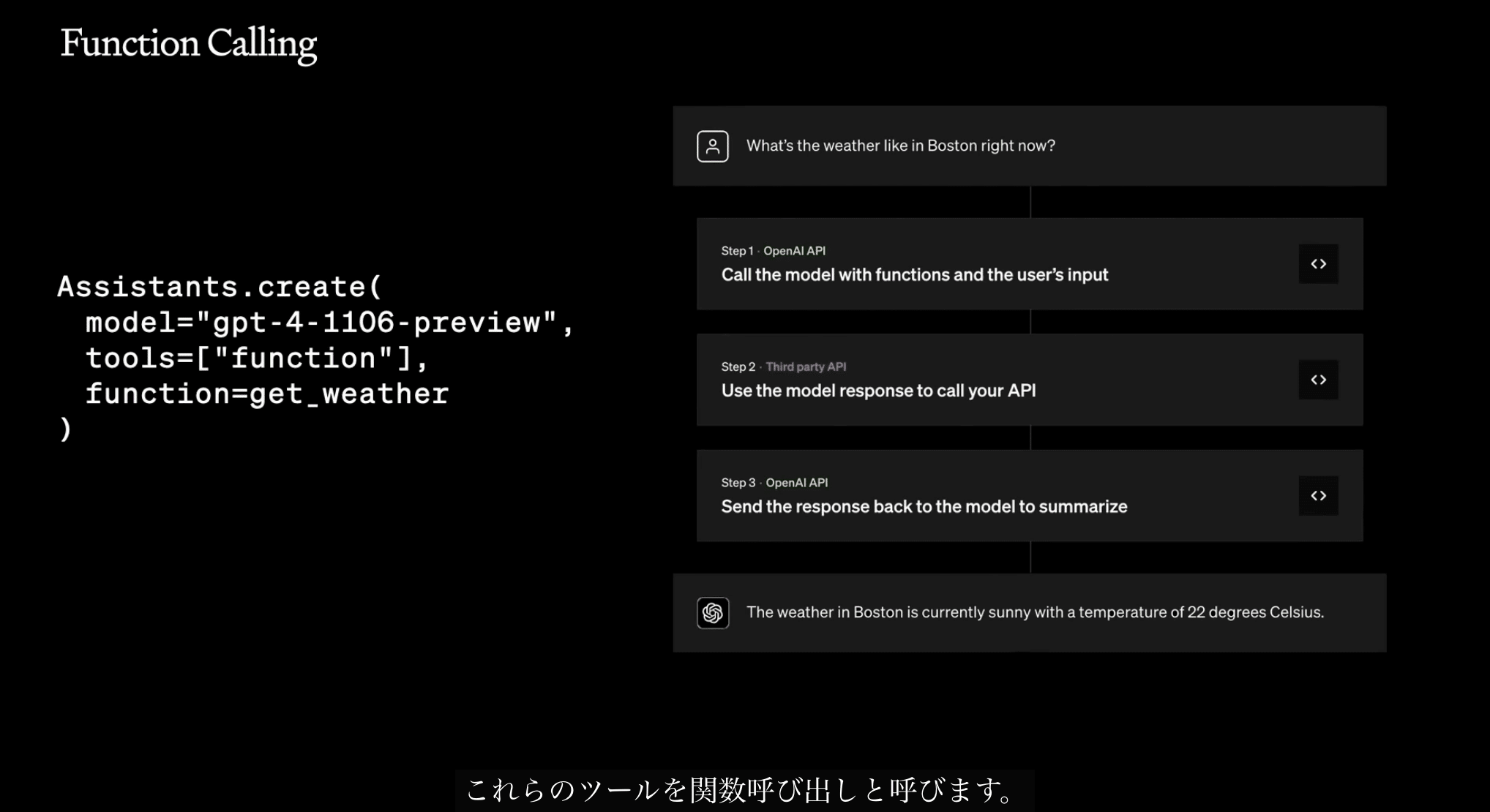 次に関数呼び出し(Function Calling)が紹介されました。関数呼び出しにより、AIは外部システムと対話し、ユーザーのプロンプトに基づく関数を実行します。JSONモードはAIの出力をJSON形式で保証し、他のシステムとの統合を容易にします。並列関数呼び出しにより、AIは複数の関数を同時に実行でき、効率と応答性を高めます。