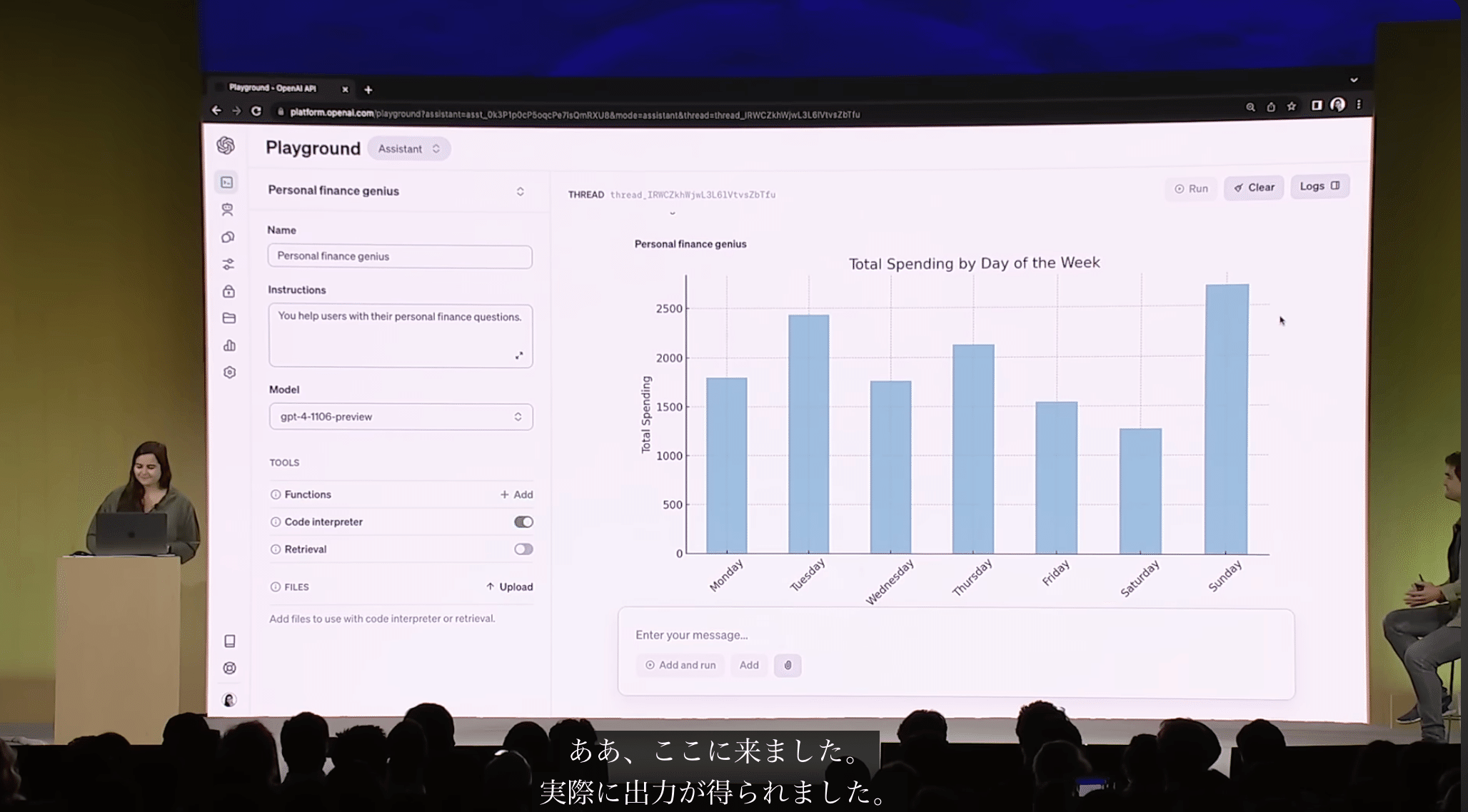 デモでは、アシスタントに財務表をアップロードし、それをチャートに変換しました。アシスタントはコードインタープリターを使い、アップロードされたファイルを基にチャートを作成しました。
