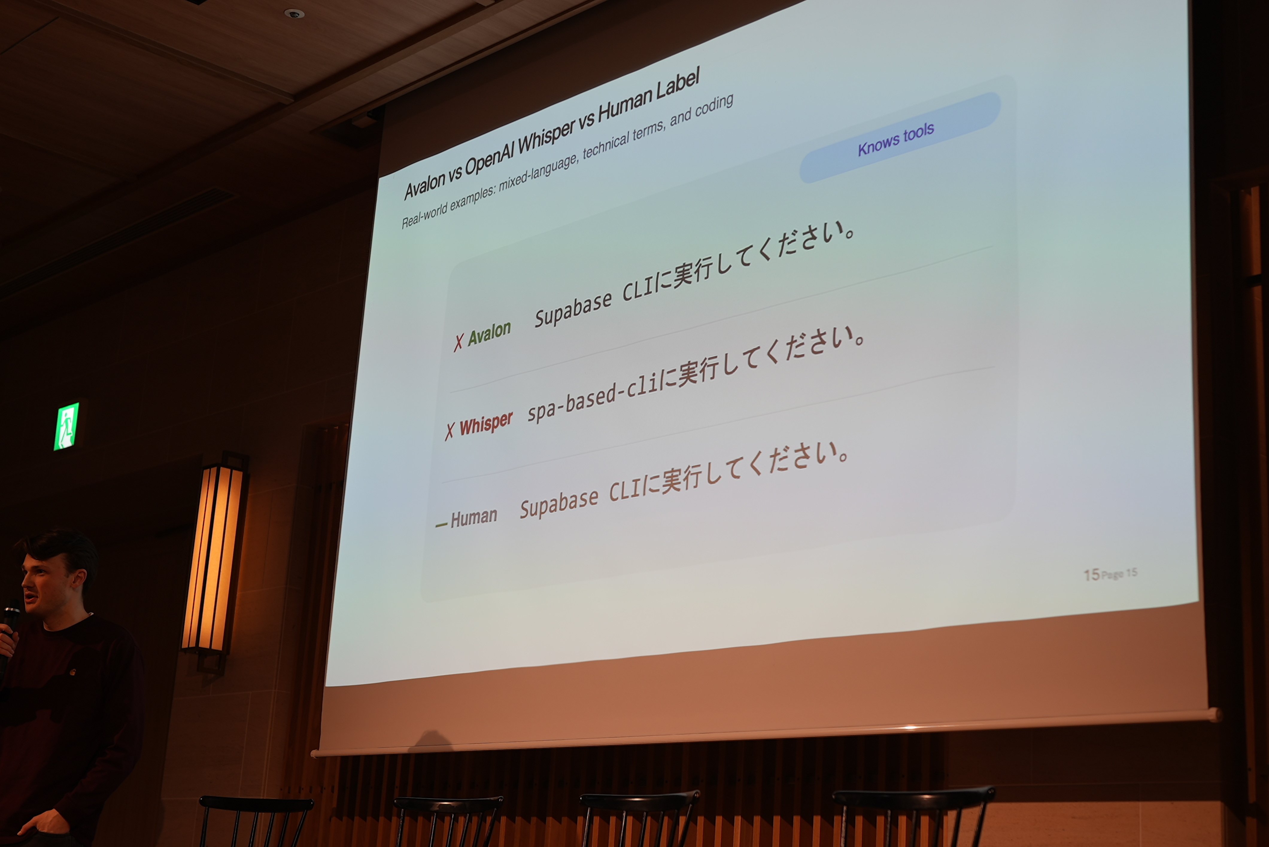 続いてAqua VoiceのCEO、Finn Brown さん(@finnatsea)が登壇。セッションは英語で進行し、リアルタイム翻訳ツールが活用されていました。