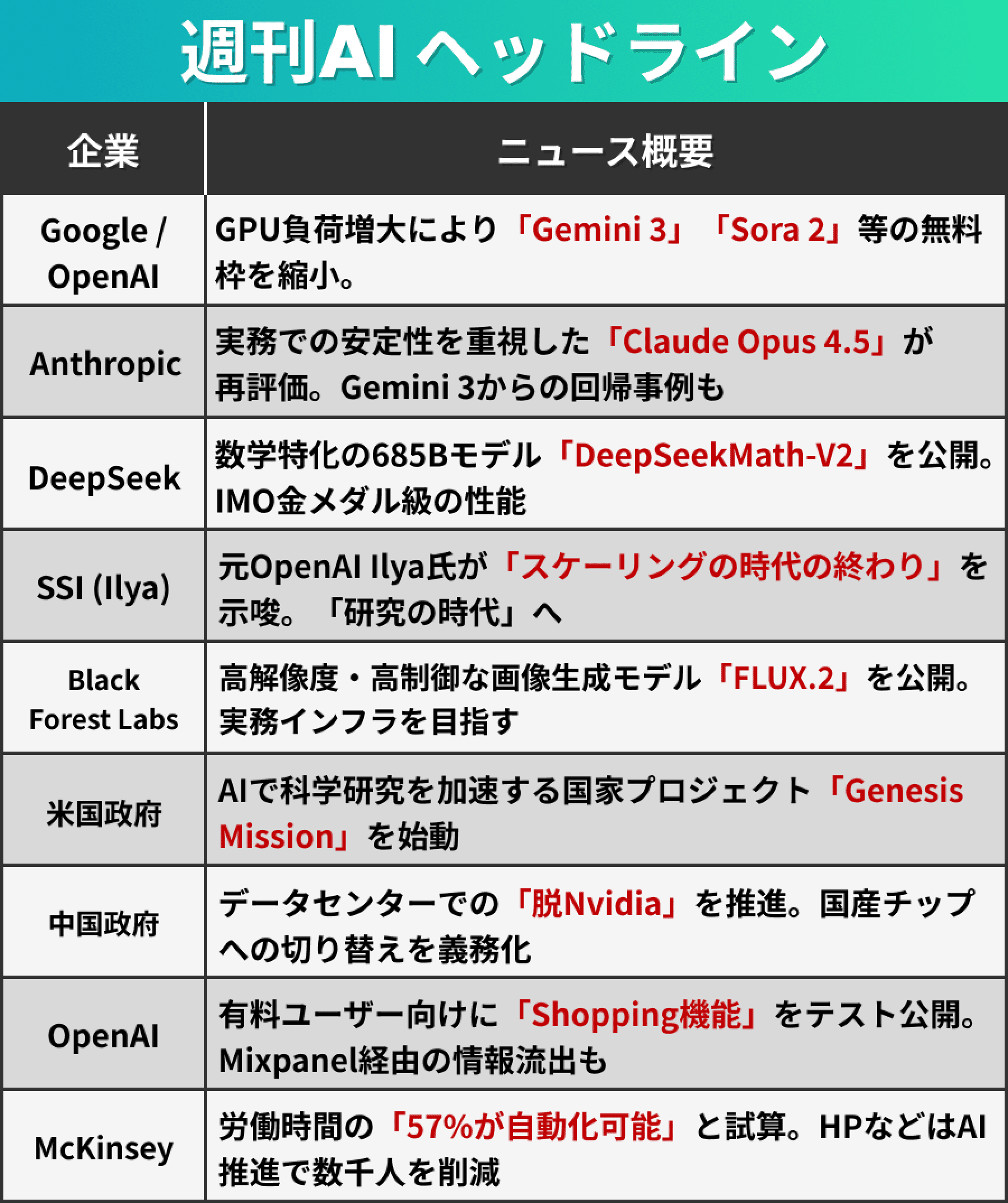 先週のような連日の発表ラッシュこそ落ち着きましたが、Claude Opus 4.5やFLUX.2が登場するなど、技術的に重要なアップデートが続いた一週間でした。