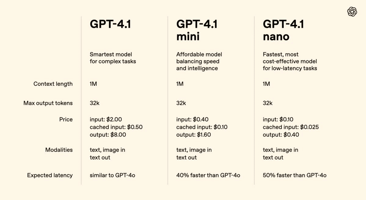 フラッグシップモデルとなる「GPT-4.1」、小型で高速な「GPT-4.1 mini」、そしてOpenAIとして初となる「GPT-4.1 nano」の3つのモデルが含まれます。