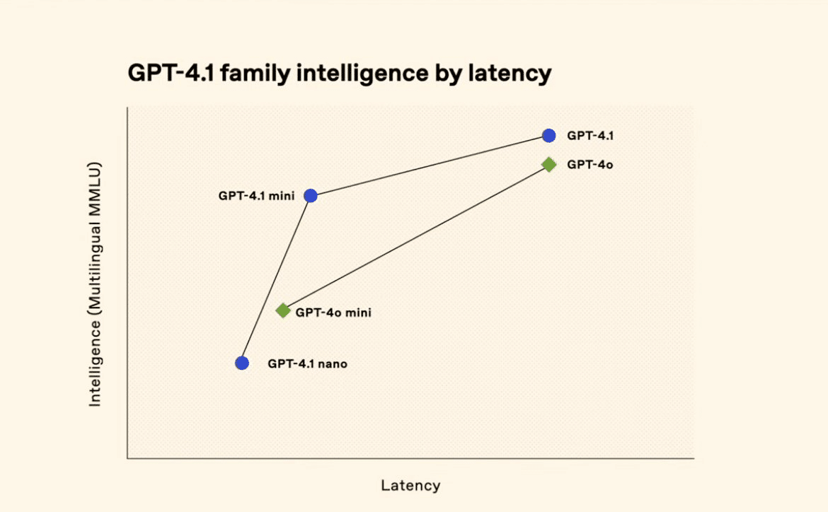 OpenAIが公開したインテリジェンス(知能)とレイテンシ(遅延)の関係を示すグラフからは、GPT-4.1ファミリーが従来のGPT-4o/4o miniの性能曲線を全体的に押し上げていることが見て取れます。特にnanoモデルは、低レイテンシ領域で新たな選択肢を提供します。