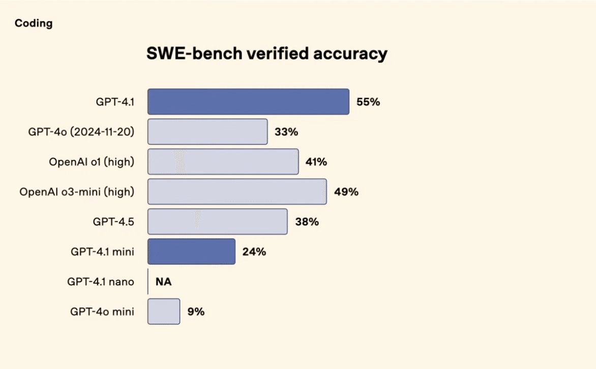 実世界のGitHubイシューを解決する能力を測るSWE-bench Verifiedにおいて、GPT-4.1は55% のタスク完了率を達成しました。