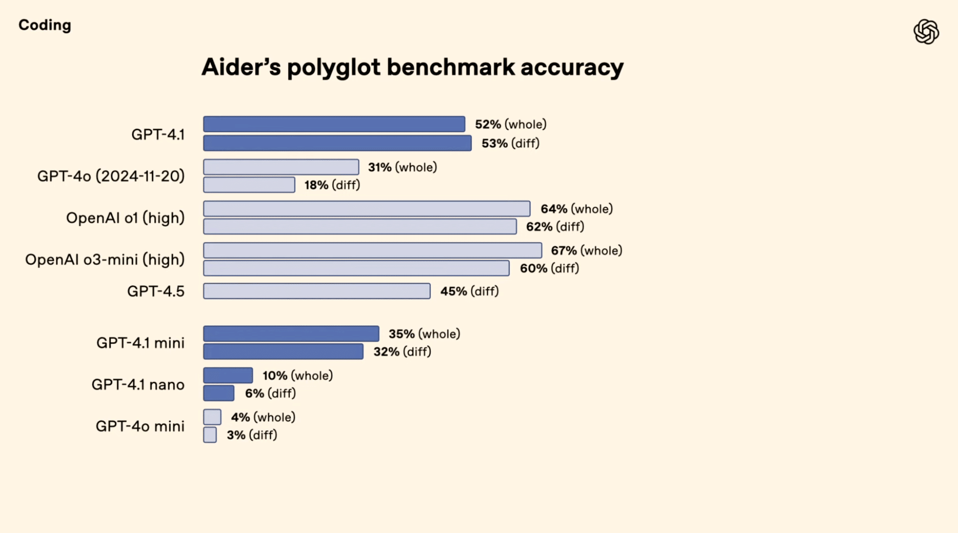 Whole形式 (ファイル全体書き換え): GPT-4.1は52% を達成。GPT-4o (31%) から向上。