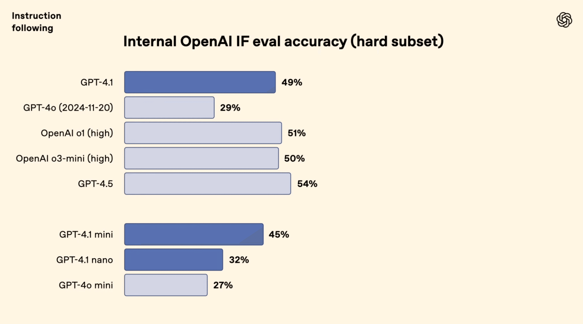 GPT-4.1ファミリーは、与えられた指示に対してより正確に従う能力も大幅に強化されました。これは、フォーマット指定、禁止事項、手順の指定など、開発者がAPIを利用する上で重要となる側面です。