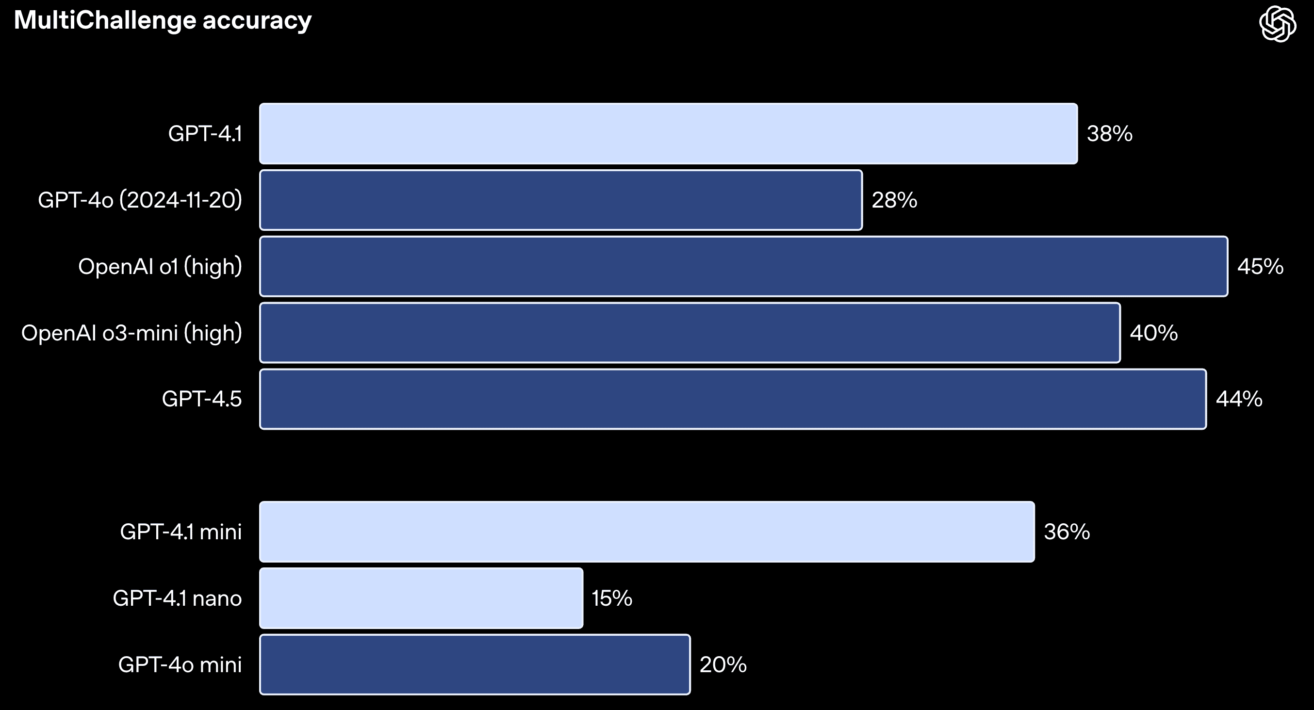 複数ターンにわたる対話においても、過去の発言内容や指示を一貫して記憶し、追従する能力が向上しています。Scale AIが提供するMultiChallengeベンチマークでは、GPT-4.1は38.3% のスコアを記録し、GPT-4o (27.8%) から10.5%ポイント(abs)向上しました。