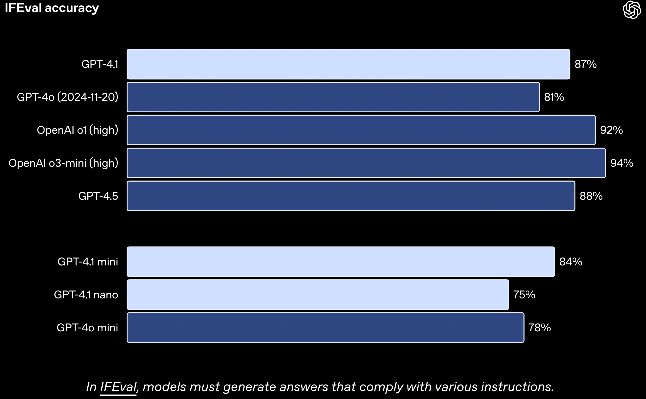応答の長さ、特定の単語やフォーマットの回避など、客観的に検証可能な指示への準拠能力を測るIFEvalベンチマークにおいても、GPT-4.1は87.4% と、GPT-4o (81.0%) から改善を見せています。