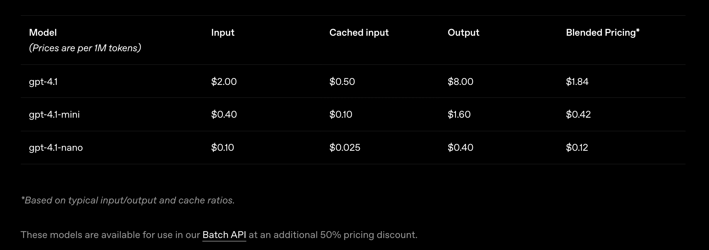 GPT-4.1のコスト削減: GPT-4.1は、一般的な利用シナリオにおいて、GPT-4oと比較して約26%安価になります (Blended Pricing基準)。