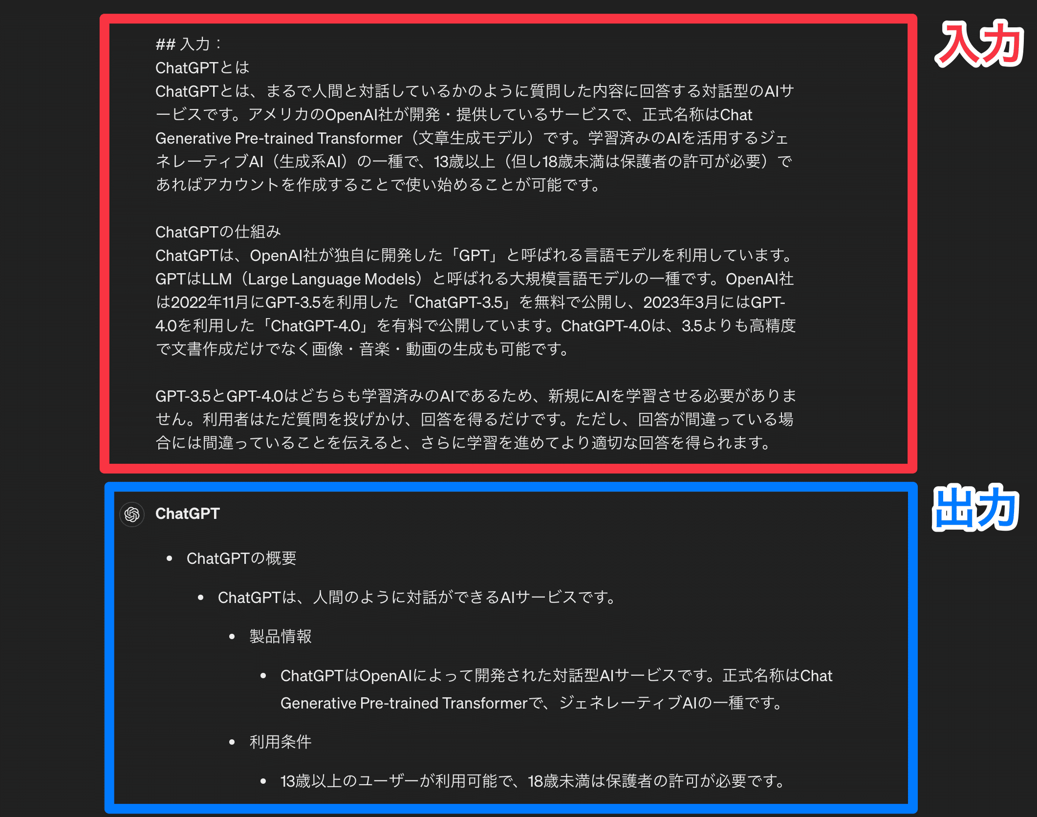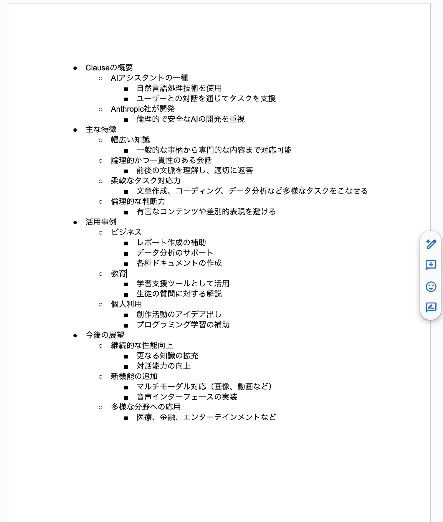 このプロンプトを使うことで、ChatGPTがプレゼンテーション用のスライドに最適化された構造のドキュメントを作成してくれます。生成されたドキュメントは、指定されたインデントを使った階層構造になっているはずです。