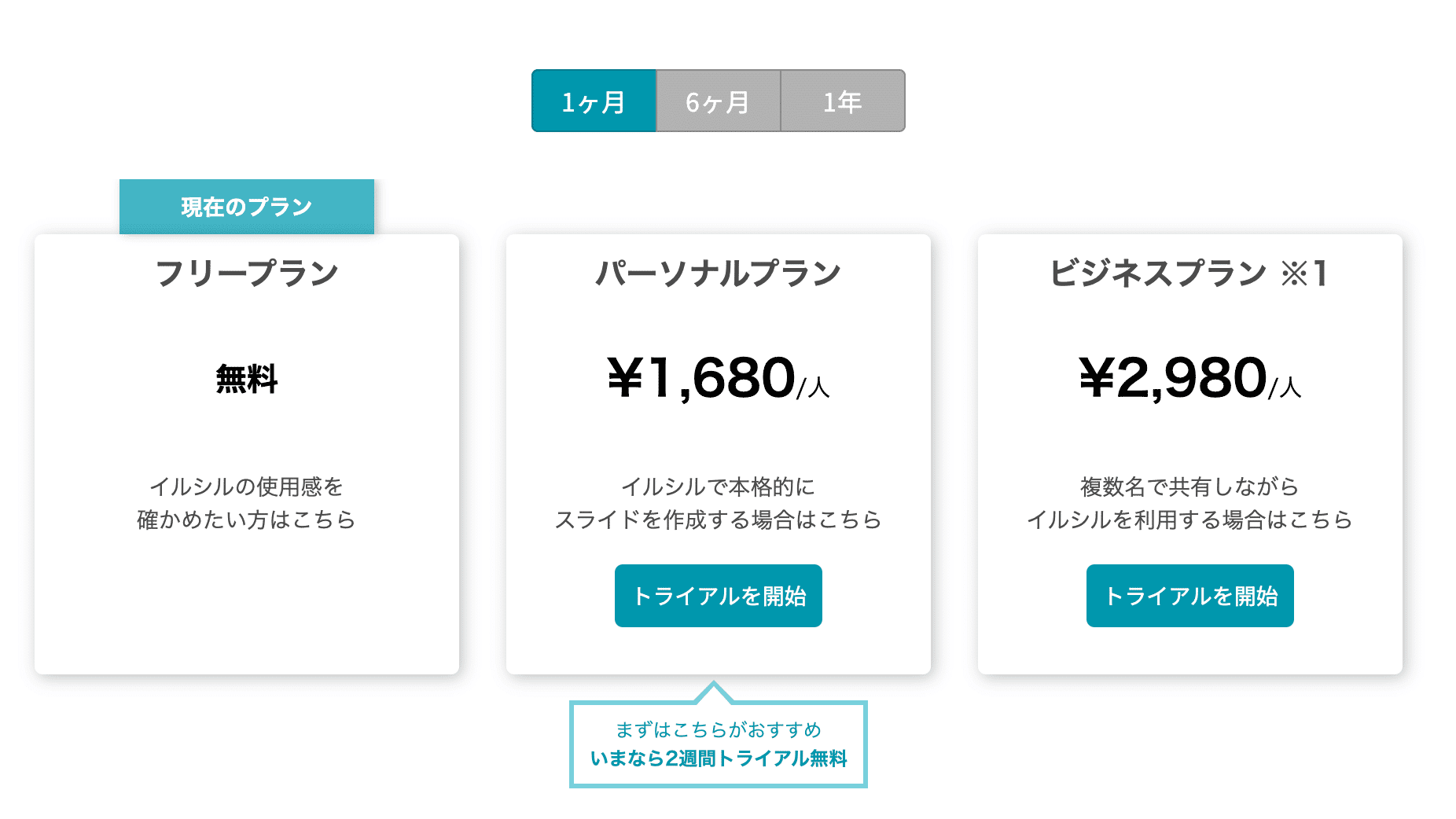 パーソナルプラン:月額1,680円(税抜)で、PDF・PPTXへの出力や無制限のドキュメント作成が可能です。