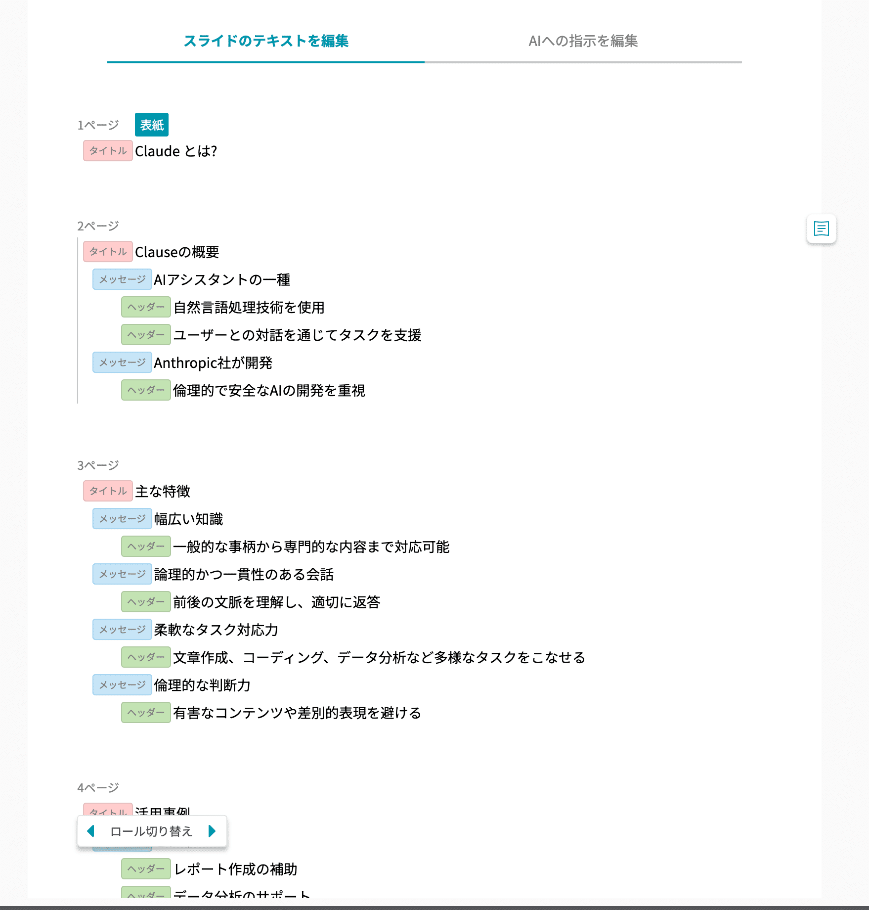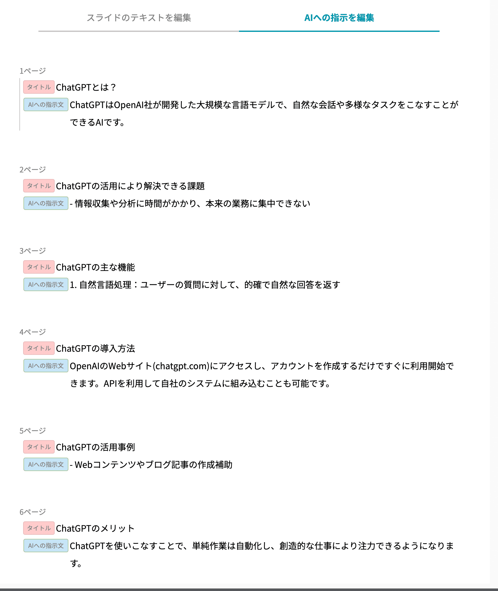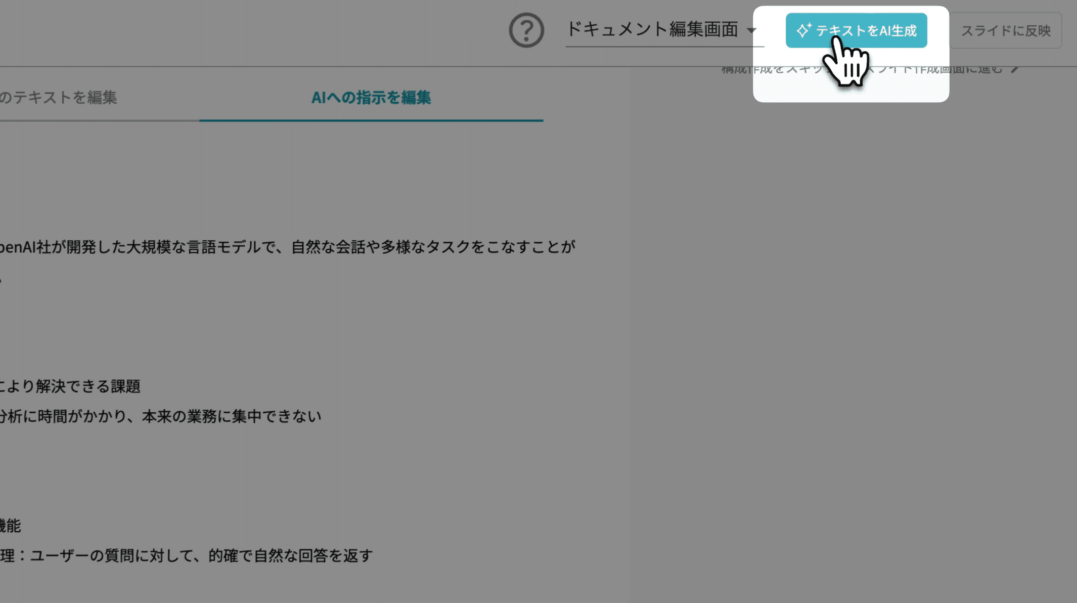 構成が固まったら、「テキストをAI生成」ボタンをクリックすると、各スライドの内容をAIが自動で生成してくれます。あとは、「スライドに反映」を押せば、スライドの初稿が完成です!