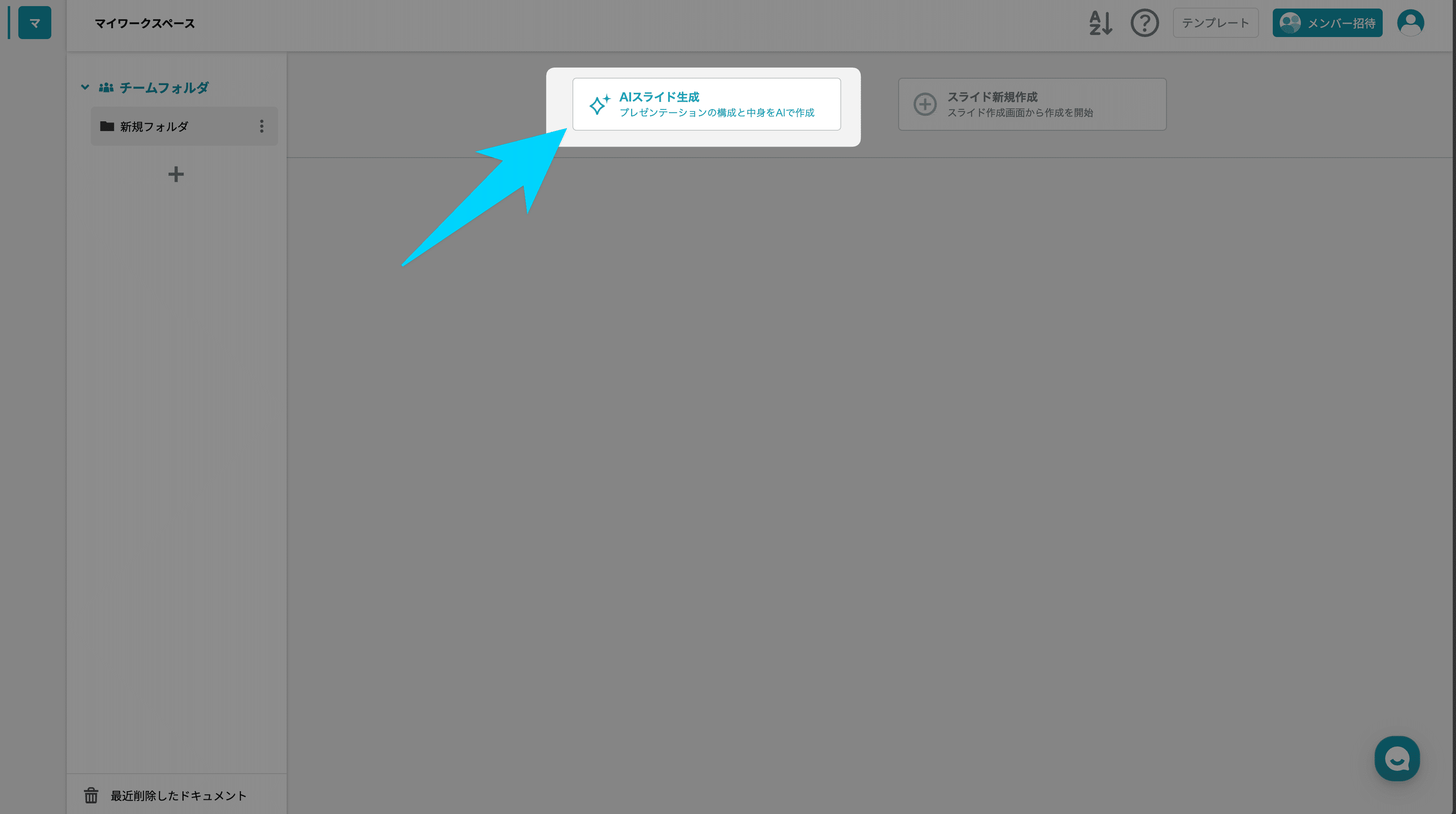 まず、ホーム画面から「AIスライド生成」をクリックします。