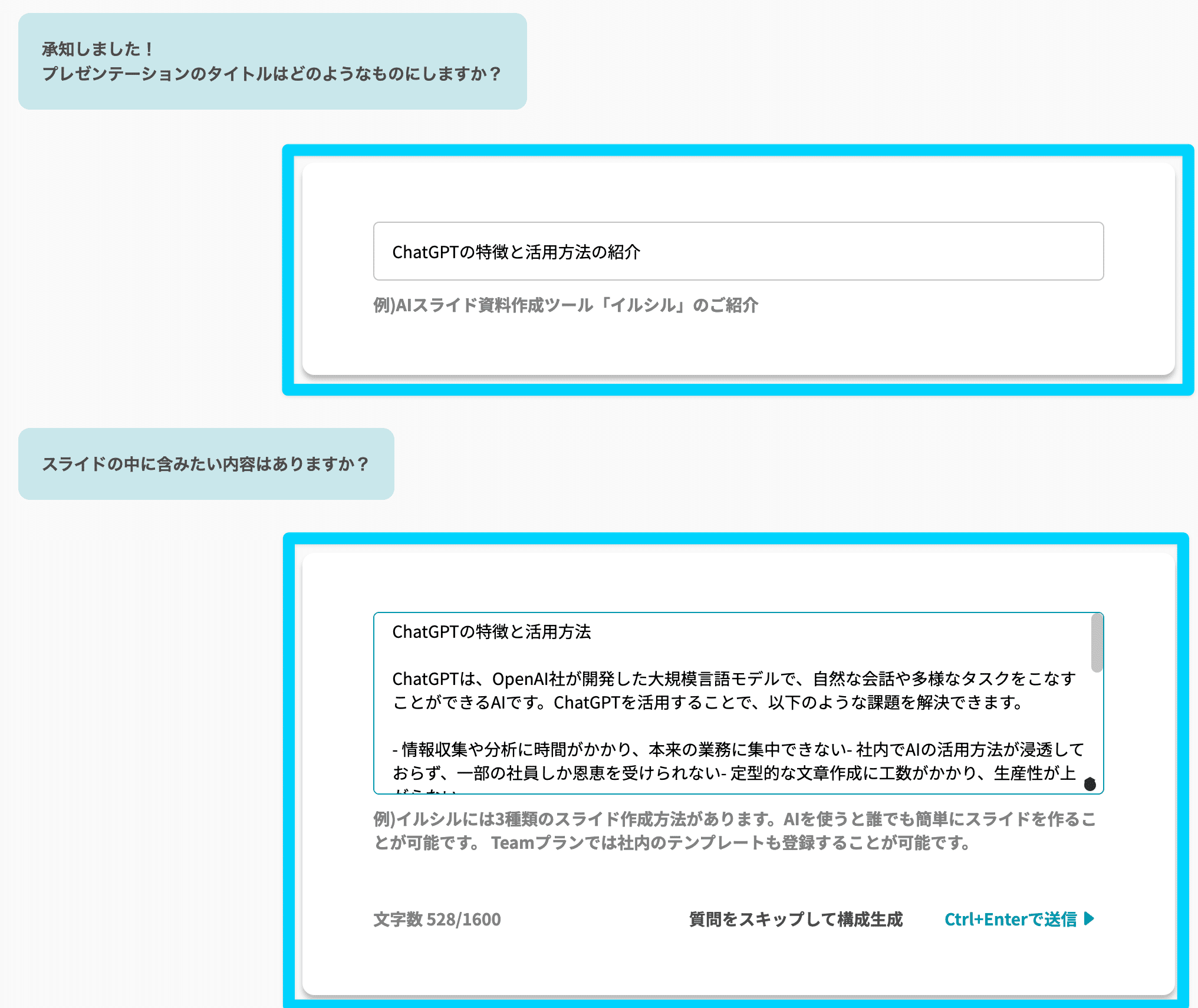 イルシルは、AIを活用することで、テーマや要点を入力するだけで、自動的にスライドを生成してくれるサービスです。