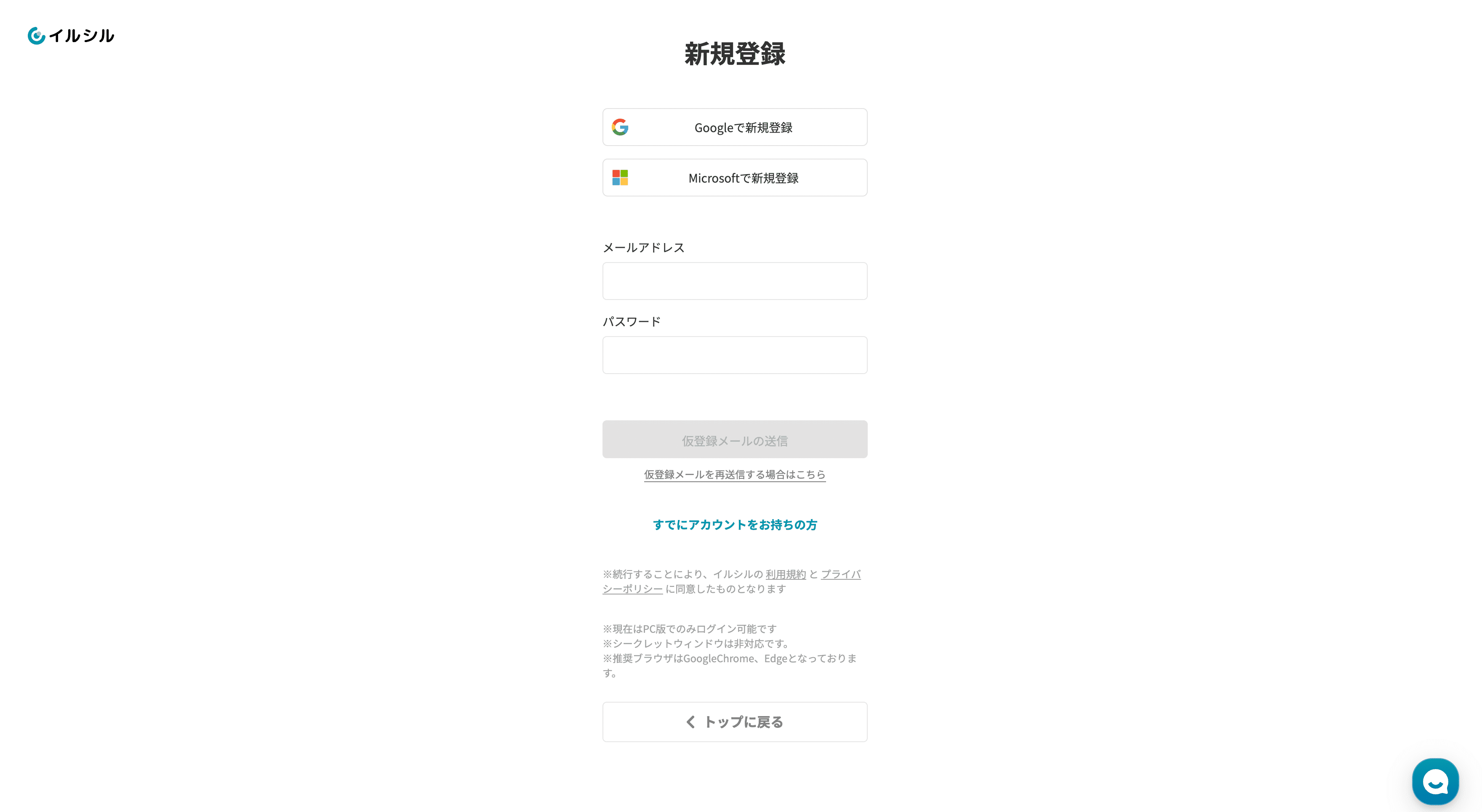 以下のリンクからアカウントを作成します。GoogleアカウントやMicrosoftアカウントなどでイルシルアカウントを作成できます。