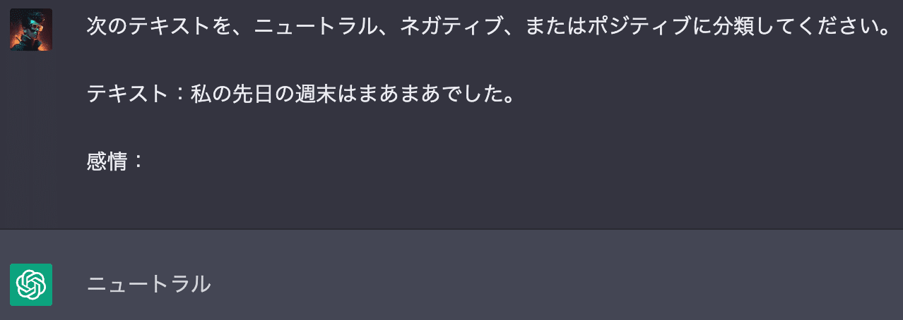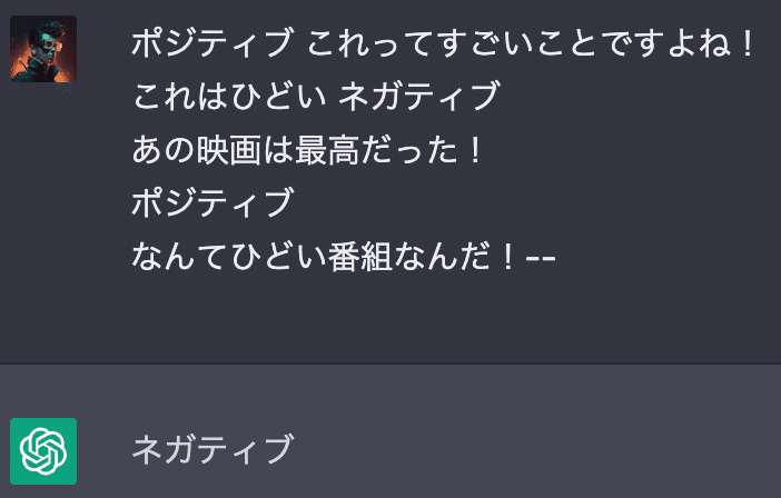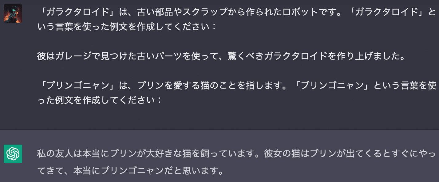 大規模言語モデルは、すでに卓越したゼロショット能力を示していますが、ゼロショットでは、より複雑なタスクで機能しない場合があります。これを改善するために、フューショット・プロンプティングが使用されます。以下の例では、GPTに出力の例の前提として提供しています。