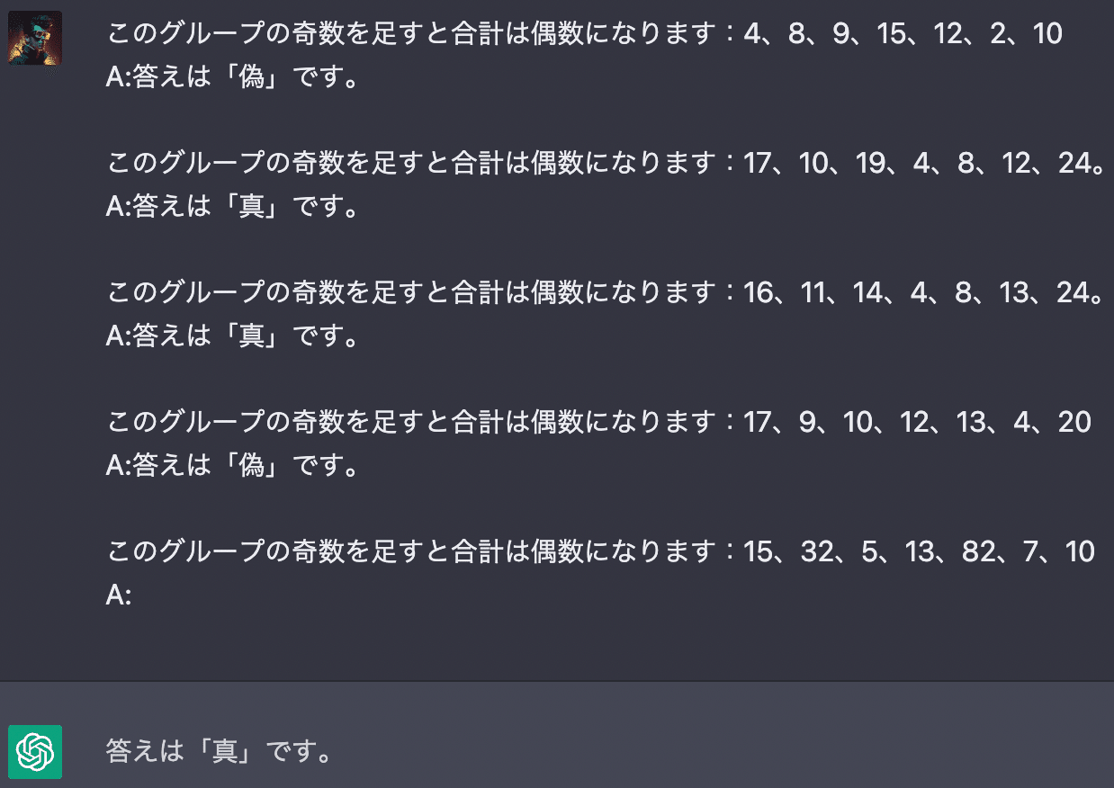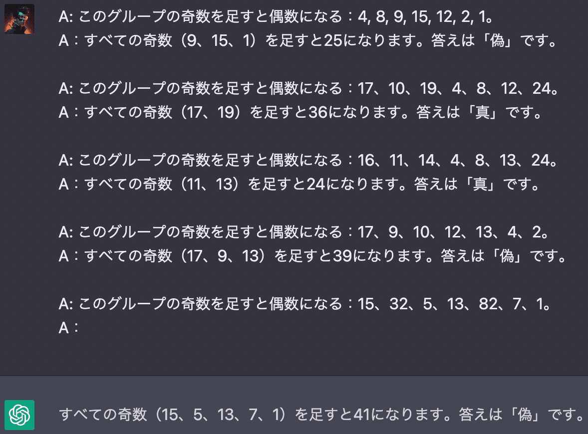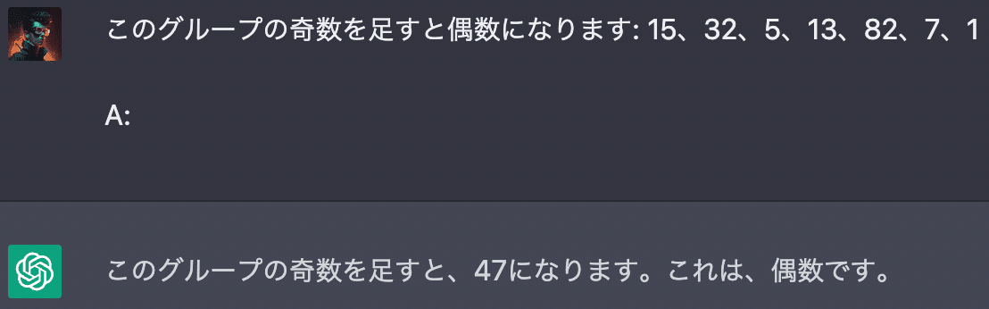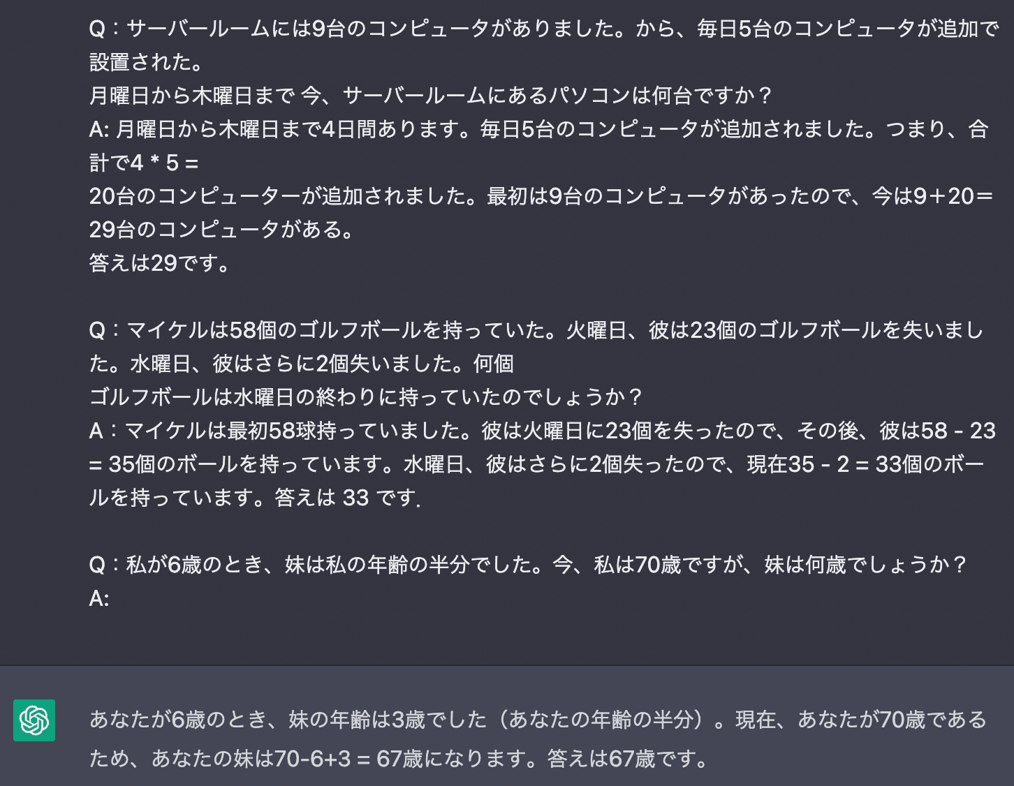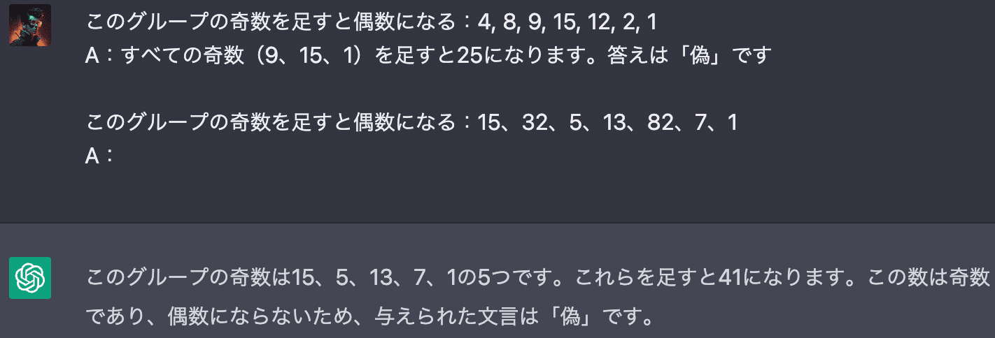 標準的なフューショットのプロンプトは、多くのタスクでうまく機能しますが、特により複雑な推論タスクを扱う場合には、まだ完璧な手法ではありません。以下の様な例では、GPT3.5でも間違ってしまうことがあります。
