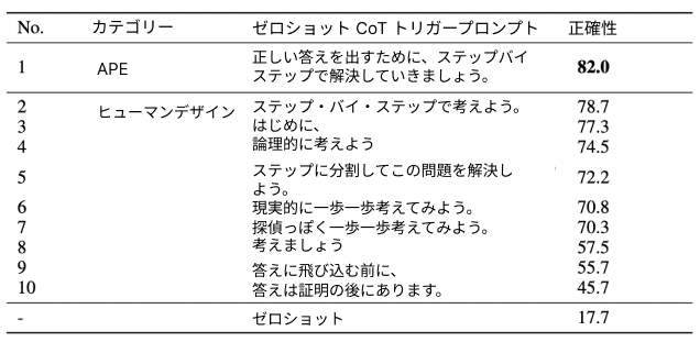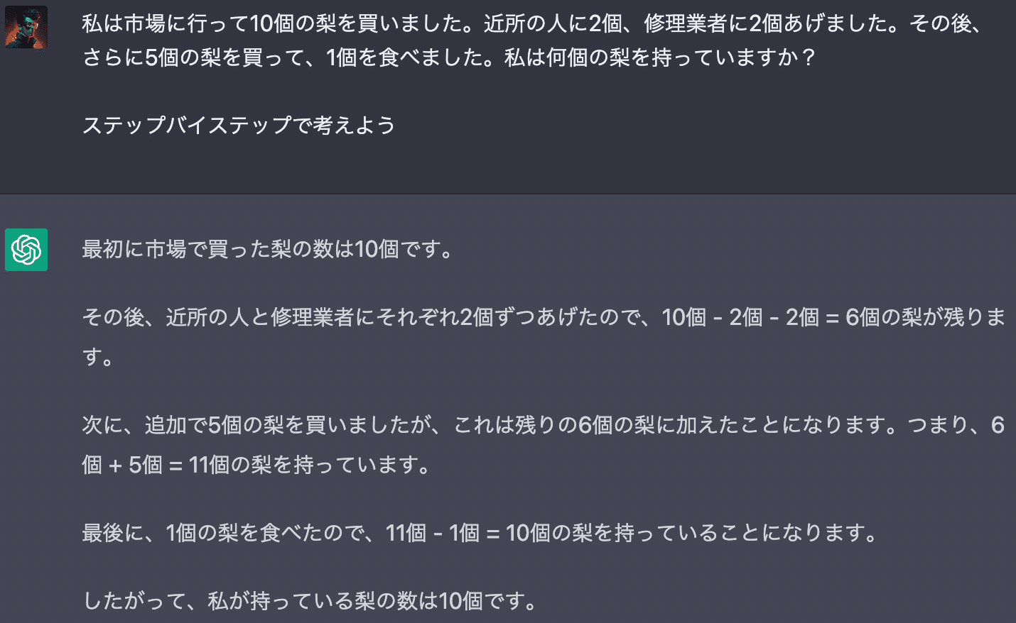 それでは、例の「ステップバイステップで考えよう」というプロンプトを入力して再度実験してみます。