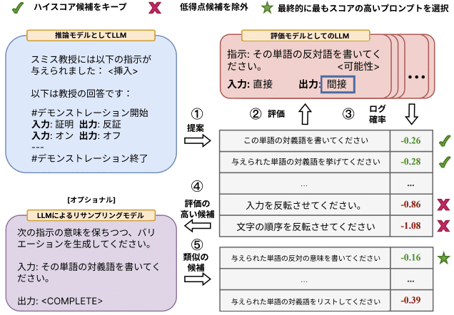 Zhou et al., (2022)は、自動的な命令生成と命令の選択のためのフレームワークであるautomatic prompt engineer (APE)を提案しています。命令生成問題は、自然言語統合としてフレームワーク化され、候補解の生成と探索のためにLLMを用いたブラックボックス最適化問題として対処されます。