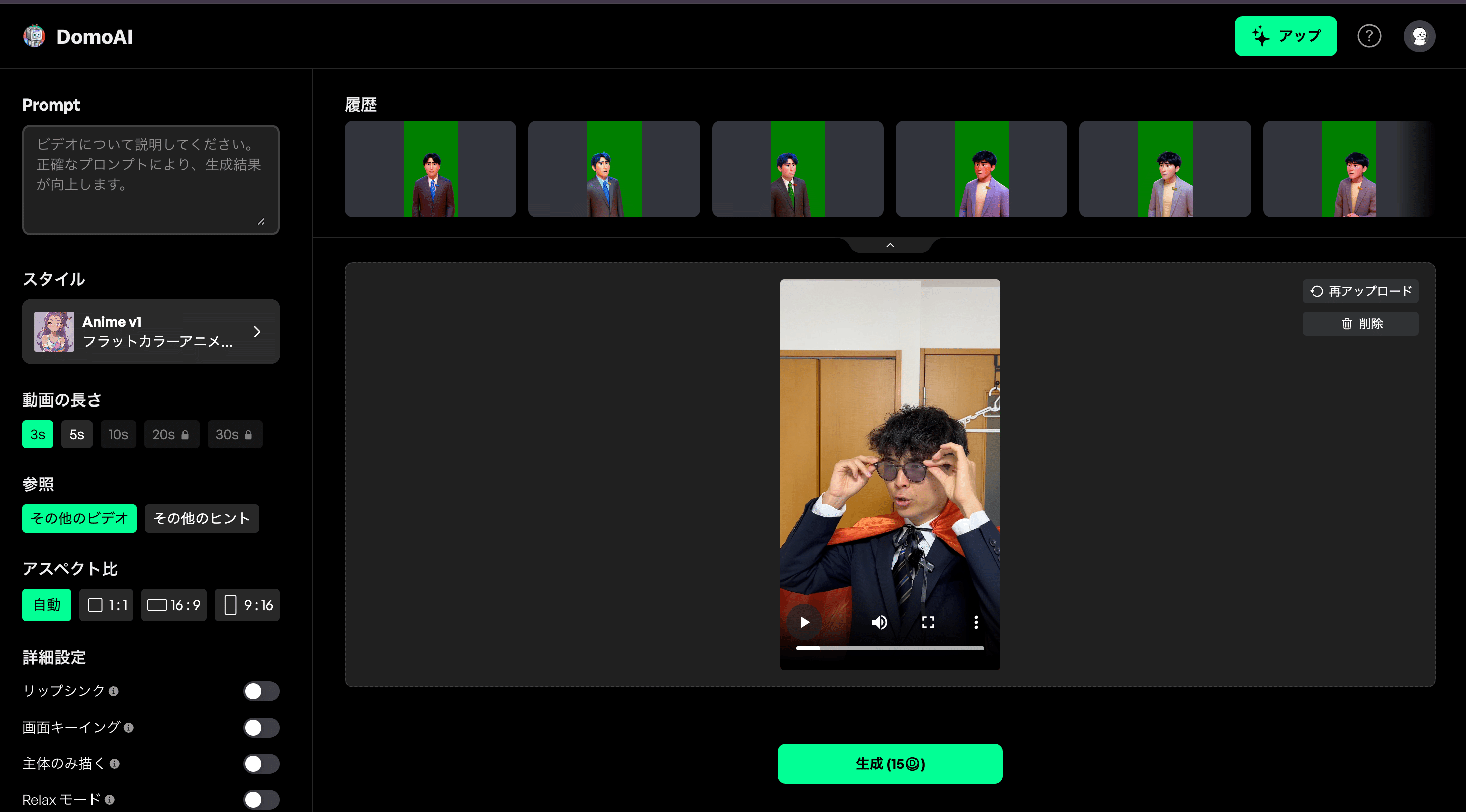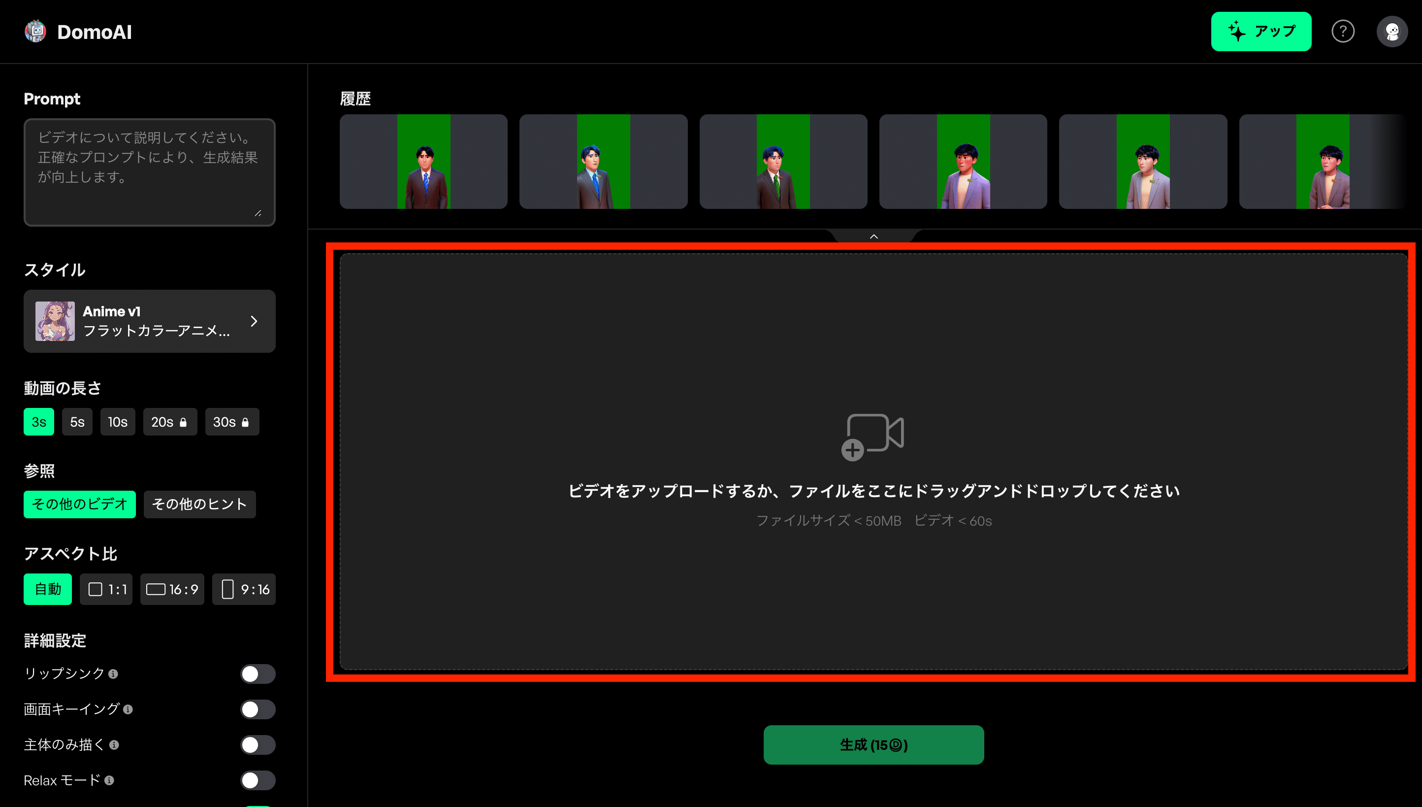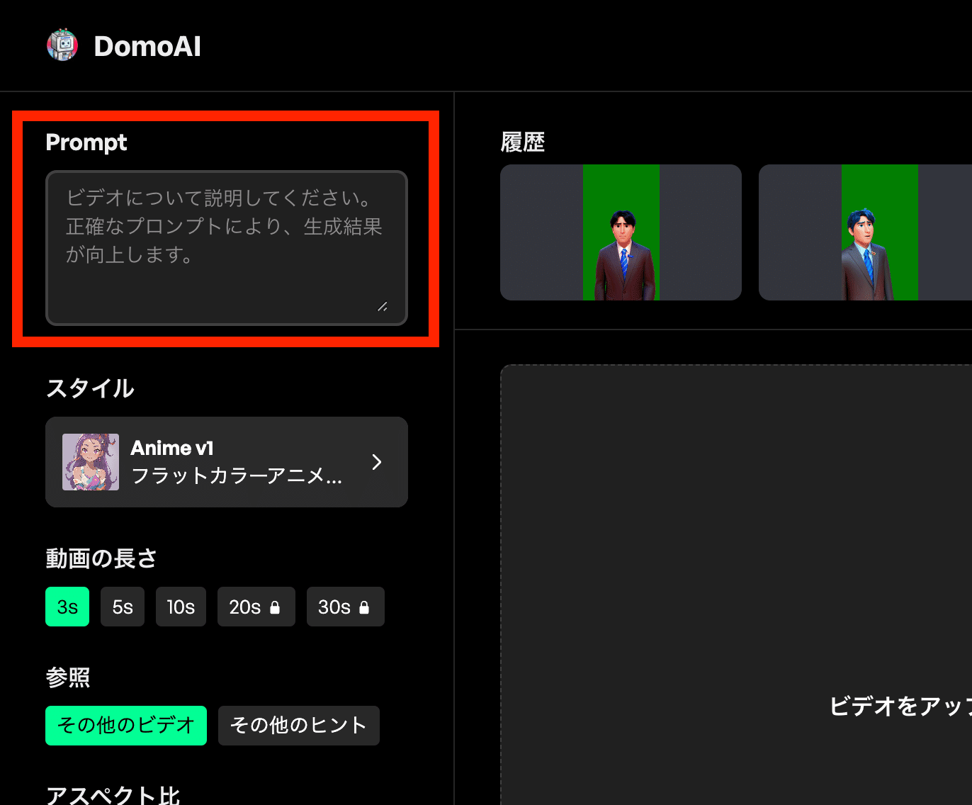 動画をアップロードしたら、「Prompt」「スタイル」「動画の長さ」「アスペクト比」「詳細設定」を下記のように設定します。