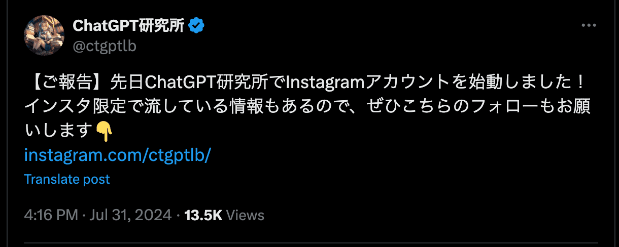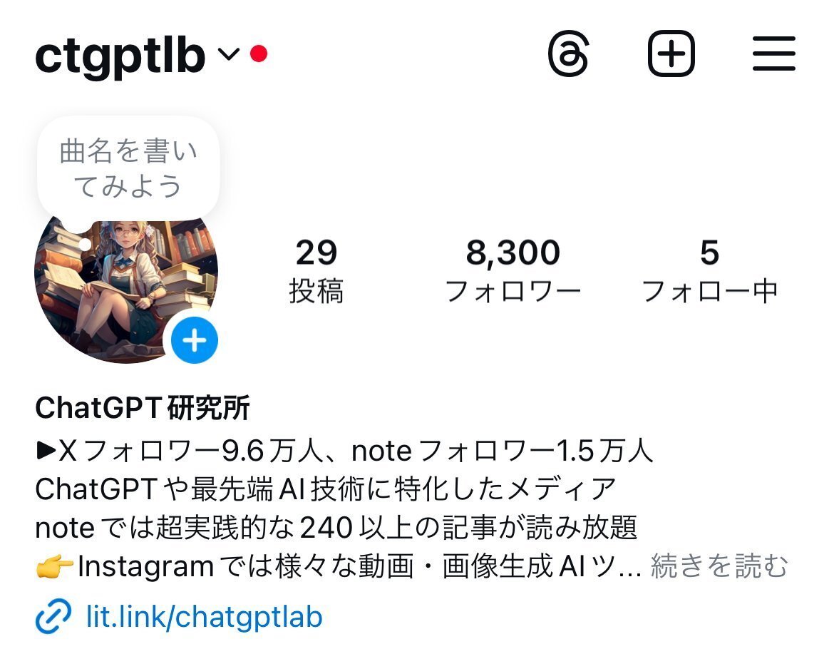 ChatGPT研究所は、Xやnoteでの発信だけでなく、Instagram(@ctgptlb)でも情報発信を行なってます。