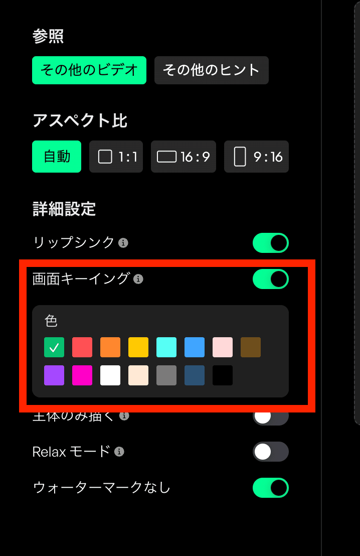 詳細設定:リップシンクON、画面キーイングON