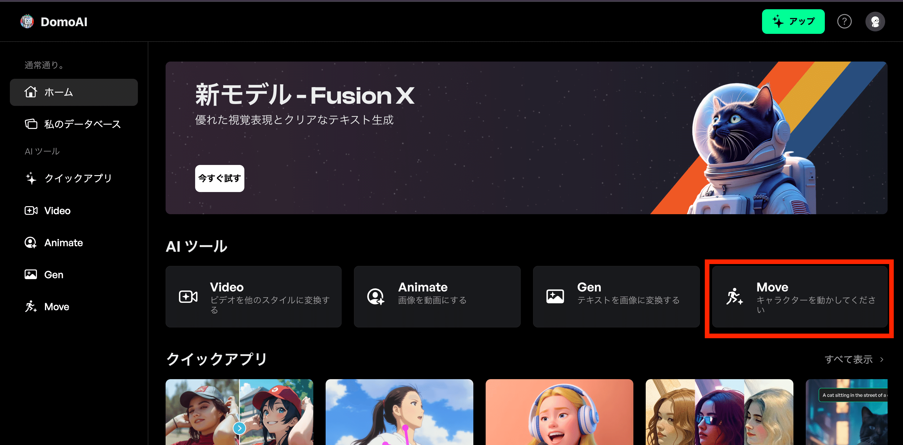 動画②は、動画①とは異なるDomoAIの機能を活用します。それが、「Move」という機能です。