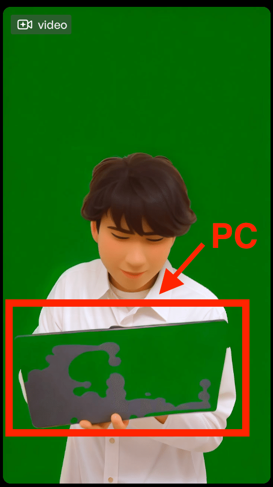 人物がパソコンを持っているシーンを撮影したこの動画では、人物だけでなくパソコンもグリーンになってしまいました。
