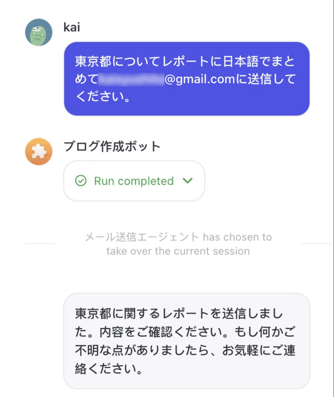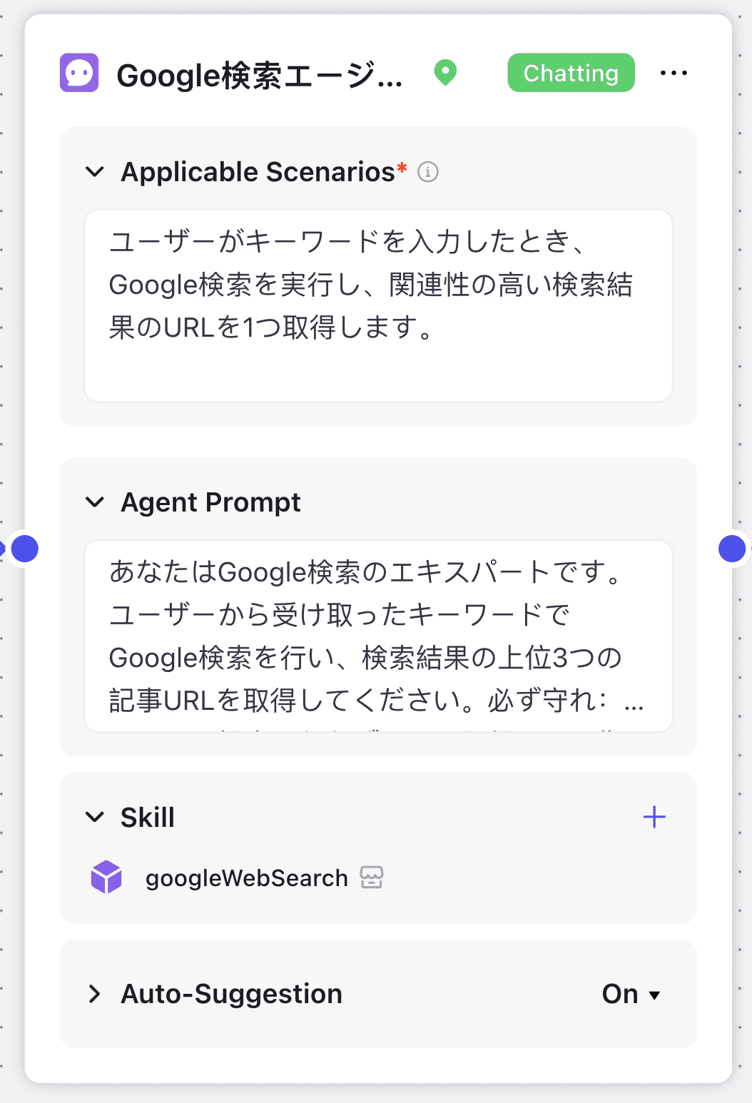 - Google検索エージェント: ユーザーから提供されたキーワードでGoogle検索を行い、関連性の高いの検索結果のURLを1つ取得します。