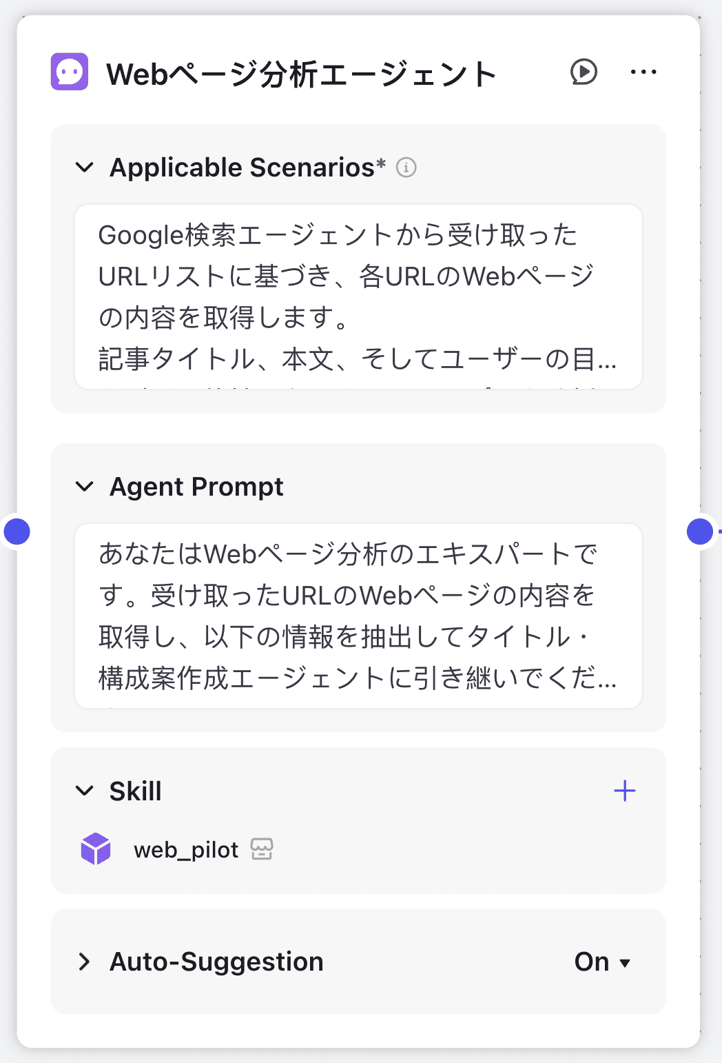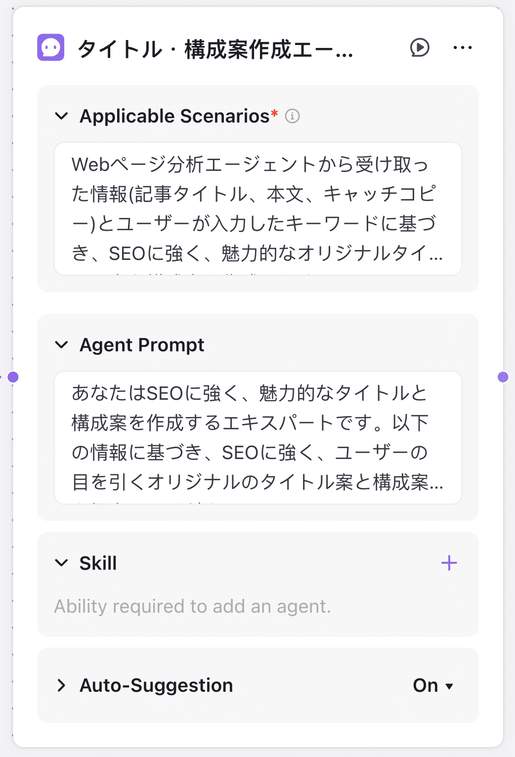 - タイトル・構成案作成エージェント: Webページ分析エージェントから受け取った情報とユーザーのキーワードを組み合わせ、魅力的でSEOに適したオリジナルタイトル案と効果的なレイアウト構成を作成します。2. 各エージェントの詳細設定