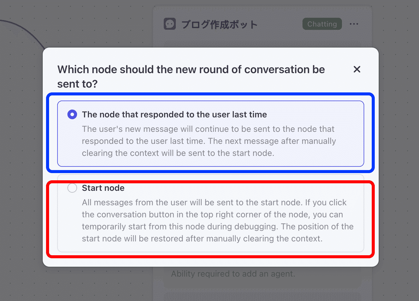 前回の続きから始めたいなら: 「最後に応答したノード」を選ぶと、前回の会話の流れを引き継げるため、ユーザー体験がスムーズになります。