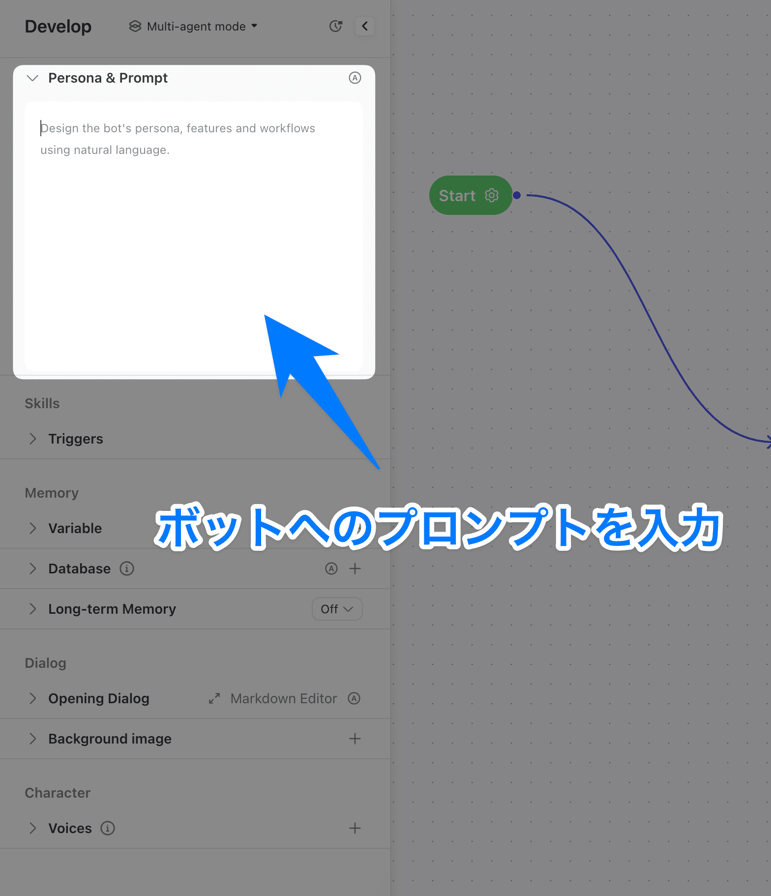 開発パネルでボットのプロンプト(エージェントに具体的なタスクを指示するための指示文)を記述し、必要に応じて他の設定を追加します。
