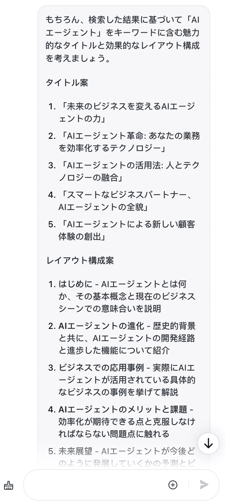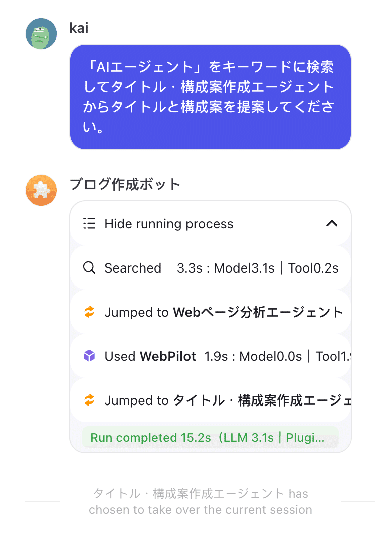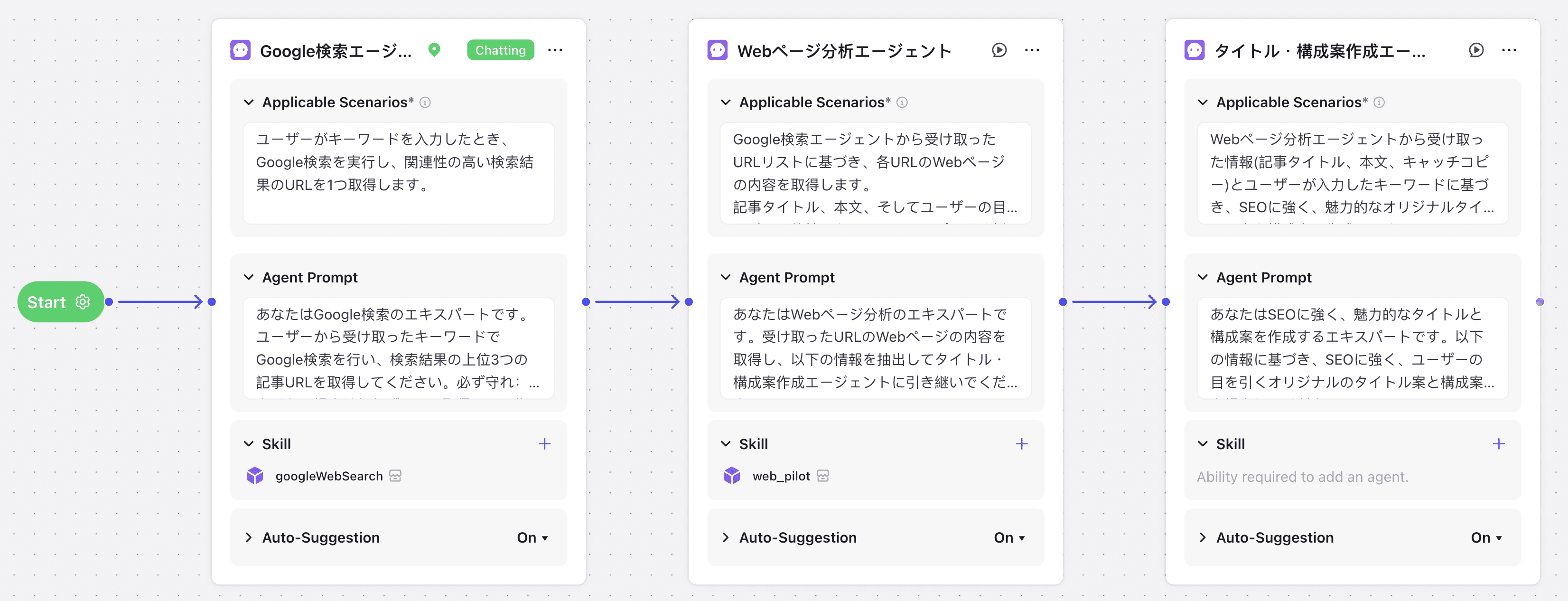 ユーザーが入力したキーワードに基づき、Google検索エージェントが関連する情報を取得し、それを元にWebページ分析エージェントが詳細な情報を抽出。最後に、タイトル・構成案作成エージェントが魅力的でSEOに適したタイトルと構成案を提案してくれています。