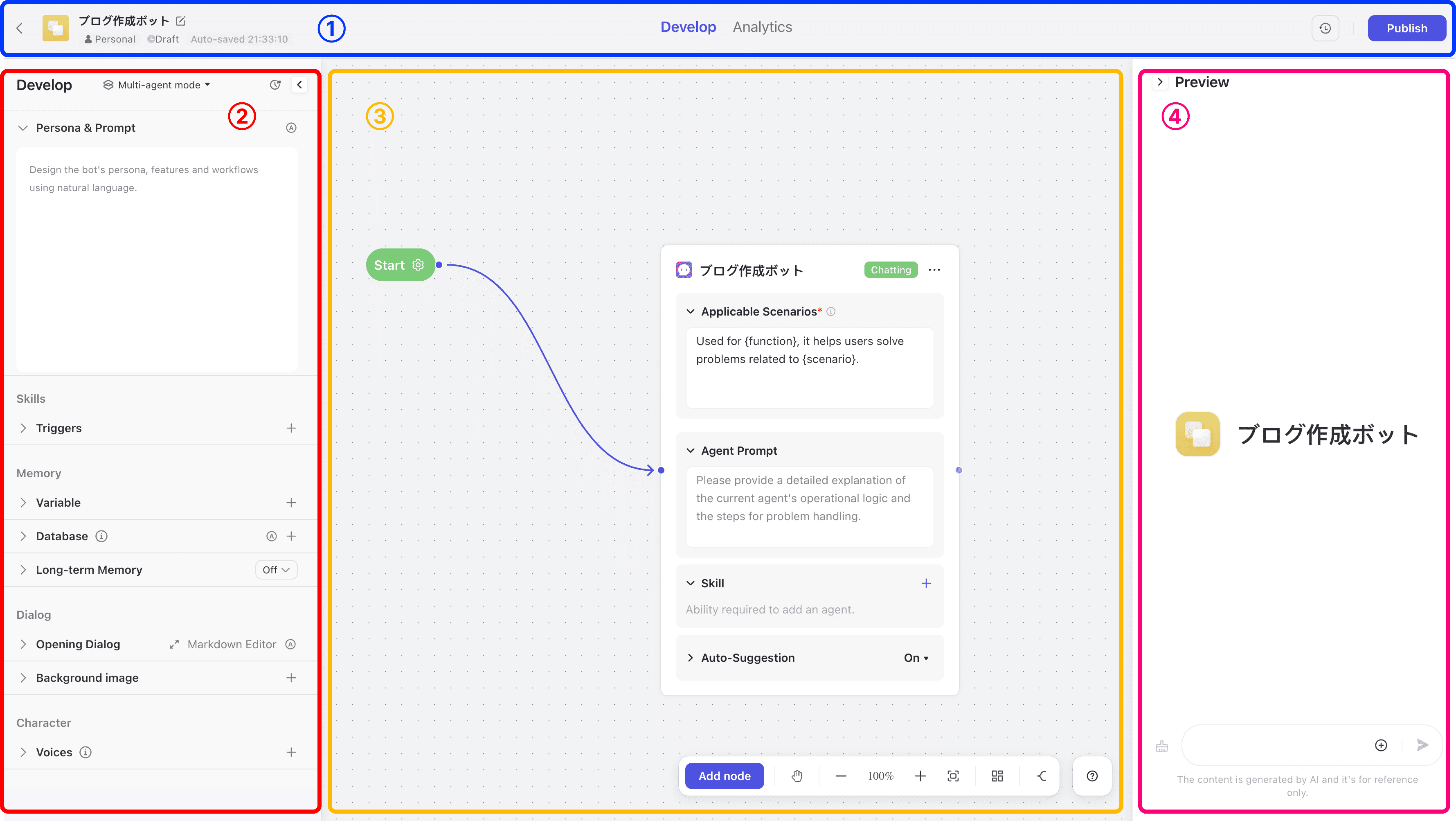 エージェントの設定は、Cozeのマルチエージェントモードでボットの機能を最大限に引き出すための重要なステップです。以下に、各エージェント設定の詳細な手順を説明します。