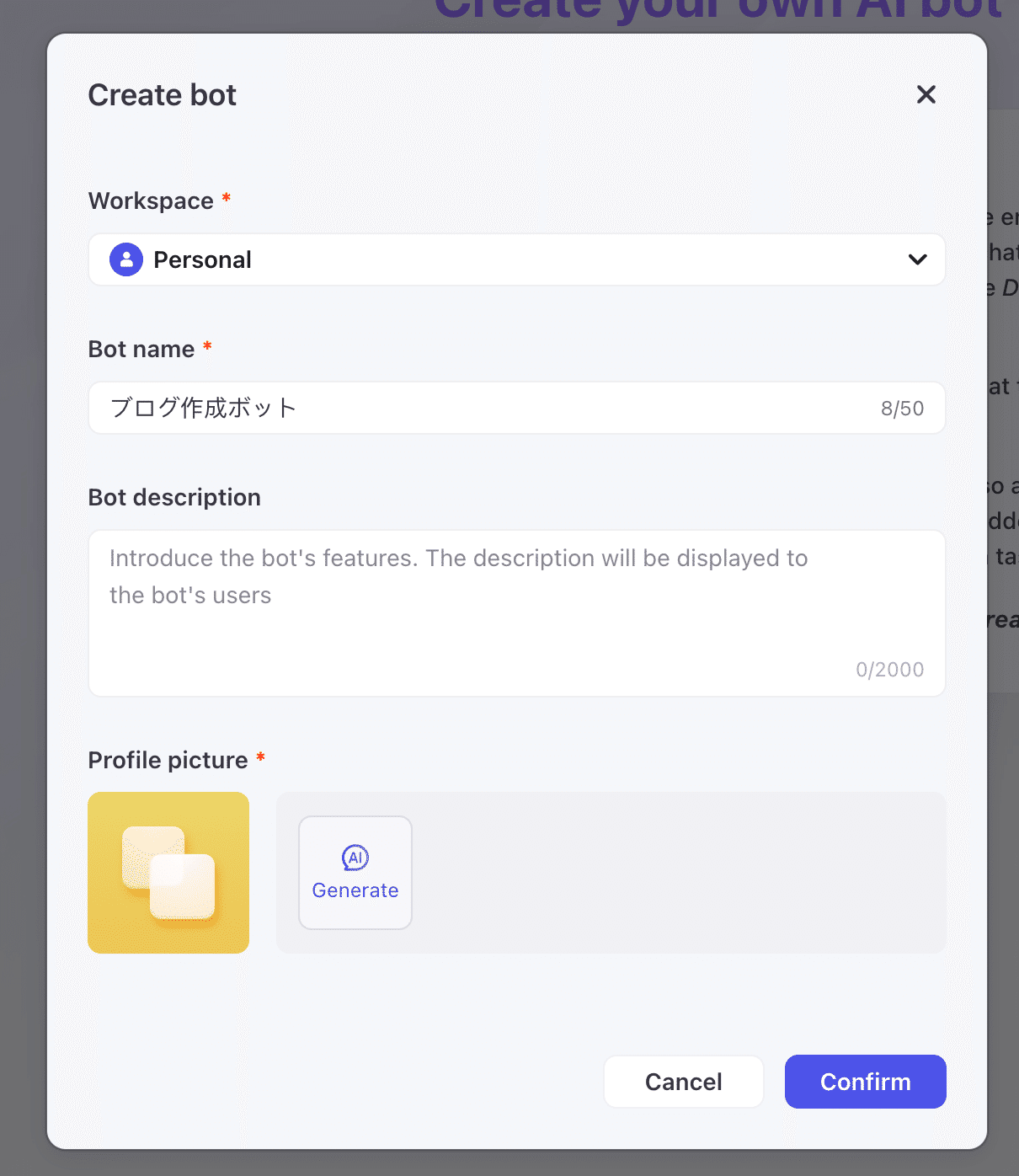 2.左側のパネルから「+ Create bot」を選択して適当な名前の新しいボットを作成します。