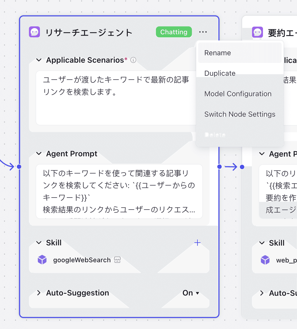 「Applicable Scenarios」セクションに、エージェントの役割や使用場面を記述します。これにより、前のノードがタスクをどのエージェントに引き渡すかを判断できます。