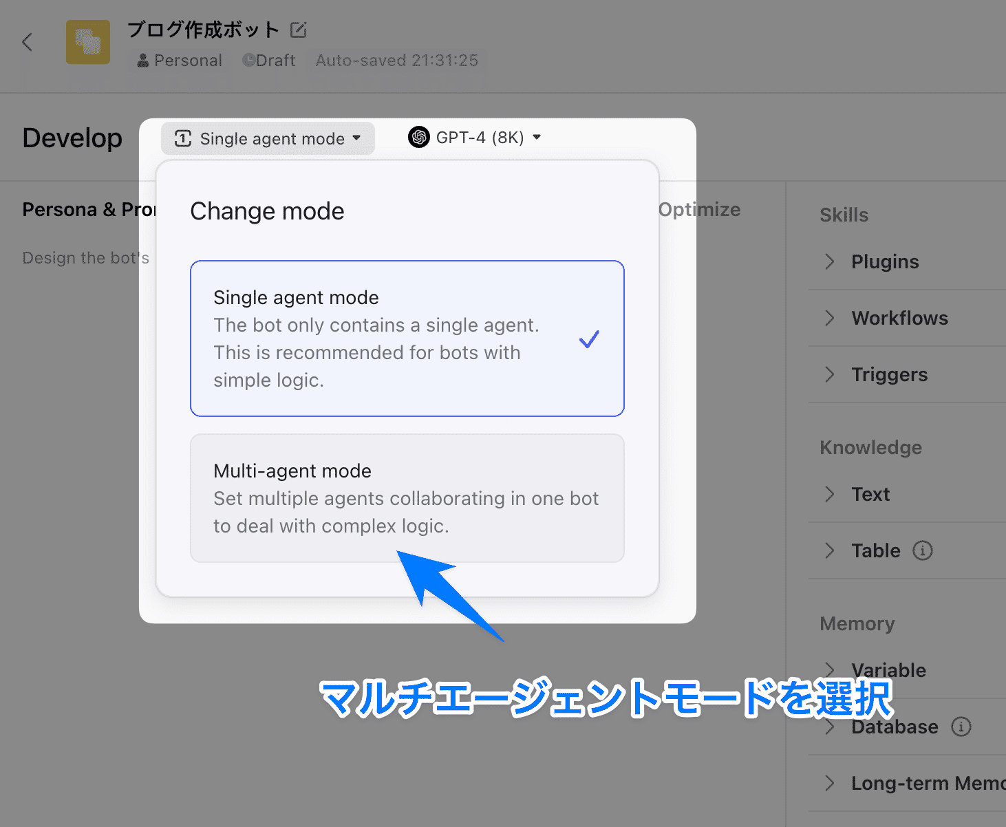3.ボットの開発ページで「Single agent mode」をクリックし、「Multi-agent mode」を選択します。