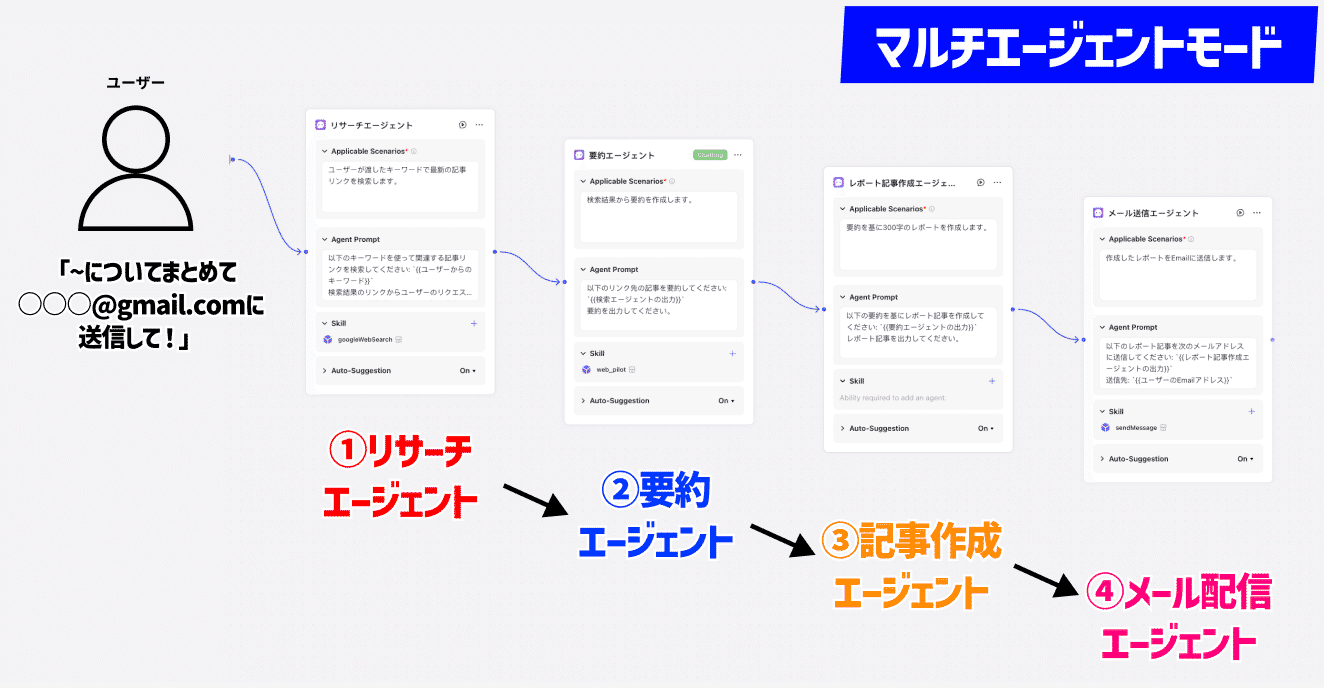 ユーザーがリクエストを送信し、それに応じてリサーチエージェント、要約エージェント、記事作成エージェント、メール配信エージェントが連携して作業を完了します。