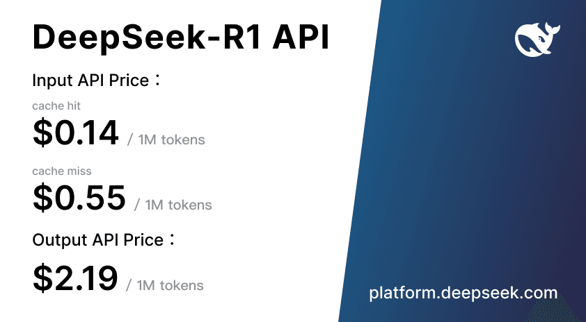 # ...課金体系はトークン単位の従量制で、$0.14 / 1M (cache hit)、$0.55 / million (cache miss)、出力トークンは $2.19 / 1M となっています。