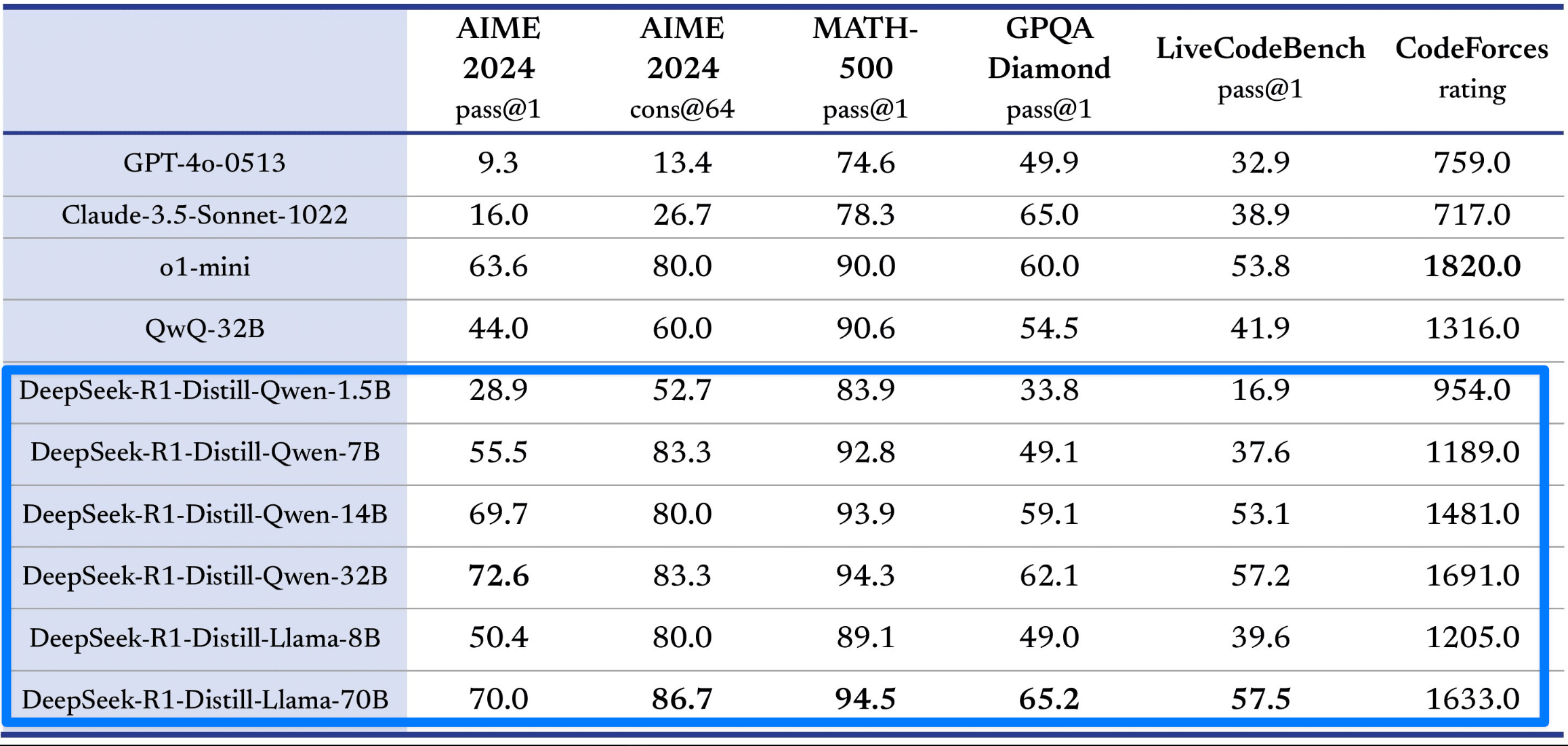 DeepSeekが公開したベンチマーク比較によると、DeepSeek-R1は大規模な数学・プログラミング・言語処理タスクで驚異的な成績を残しています。